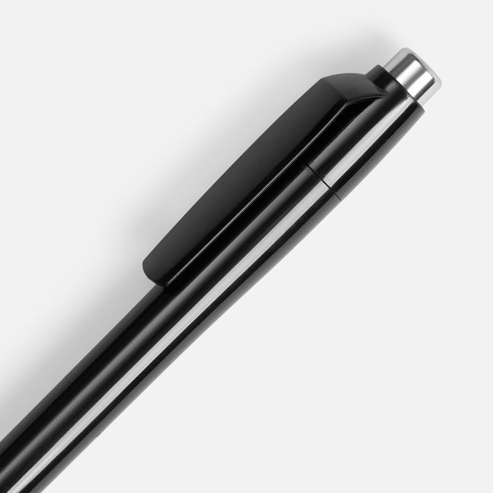 Пластиковая ручка с глянцевым корпусом и хромированными деталями. Большой клип идеален для нанесения логотипа компании.