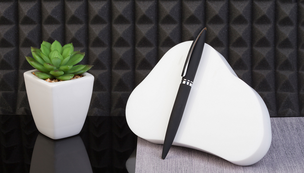 Тонкий цельнометаллический клип подпружинен и имеет ход до 5 мм для удобства зацепления. Деловой имидж ручки подчеркивает солидный вес - 34 г. Матовое прорезиненное покрытие хорошо сочетается с блестящими хромированными элементами.