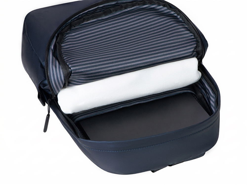 Элегантный легкий городской рюкзак из мягкого приятного на ощупь материала можно использовать для передвижений по городу, а так же в поездках, для чего на спинке предусмотрен ремень для крепления на ручку чемодана. Для удобства и компактного хранения содержимого снаружи расположены 2 передних кармана на молниях и 2 боковых кармана. Внутри уплотненный карман для ноутбука. Стильная подкладка в полоску в тон цвета внешнего материала делает рюкзак модным аксессуаром. Благодаря водостойкому материалу и молниям содержимое рюкзака не намокнет под дождем. Лямки регулируются по длине.