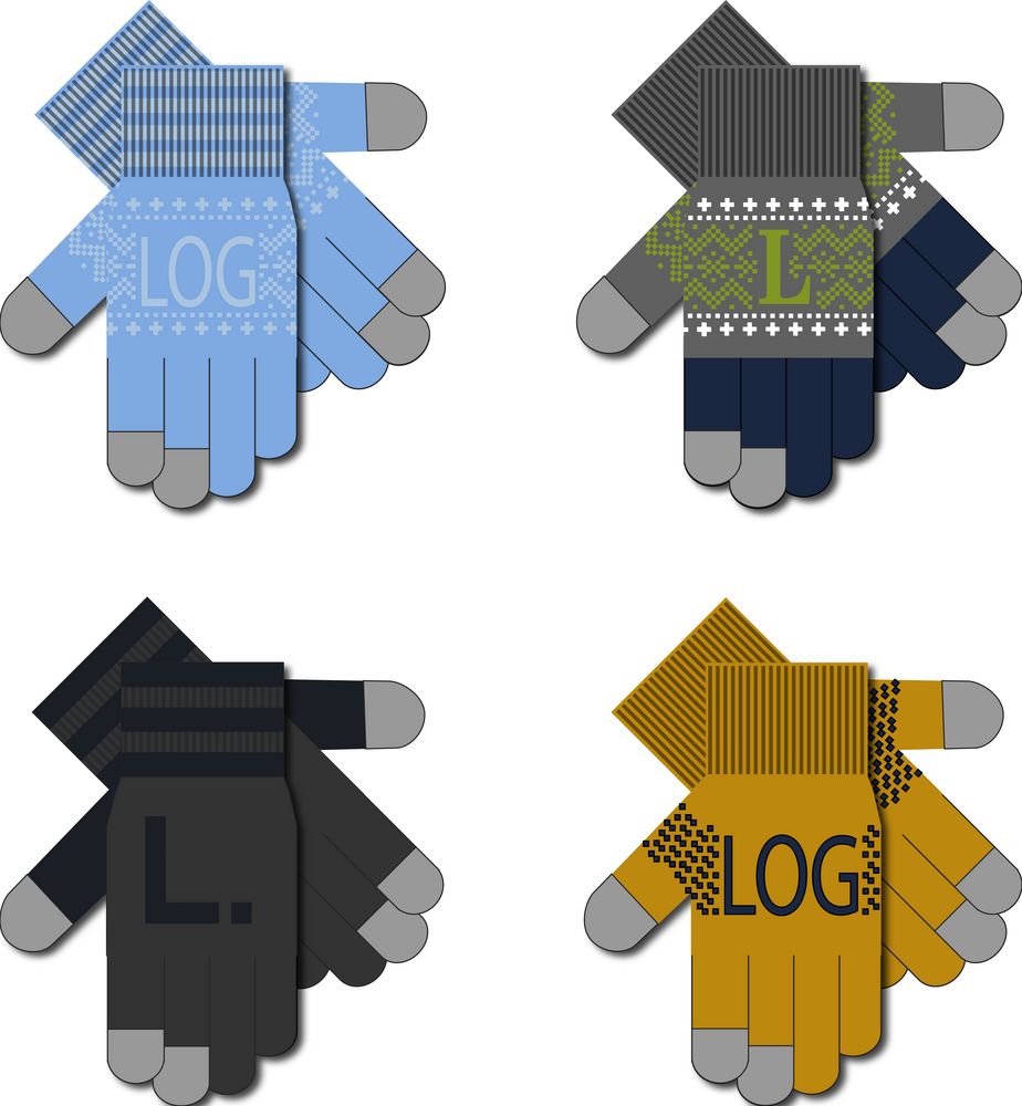 Модель: цельновывязанные бесшовные перчатки с эластичной манжетой и жаккардовым узором в 2-3 цвета. Три пальца: средний, указательный, большой — вяжутся с использованием токопроводящей нити. Манжета может быть полосатой (только горизонтальные полосы 1-2 цветов, без узора и логотипа).