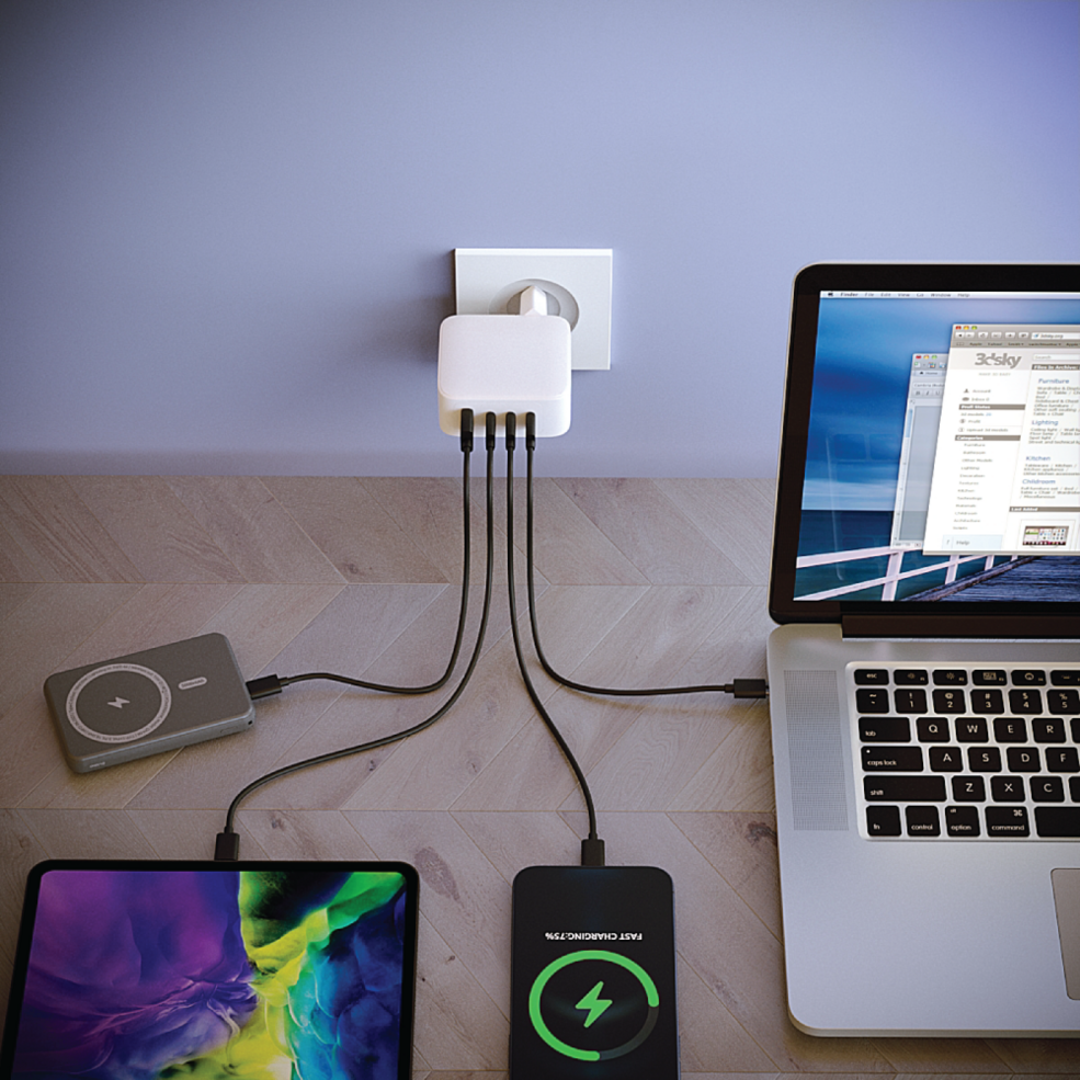 Особенности: оснащено протоколами быстрой зарядки PD и QC; обладает защитой от перегрева и перегрузки; 3 выхода Type-C и 1 USB для быстрой зарядки всех ваших устройств; общая выходная мощность 100 Ватт