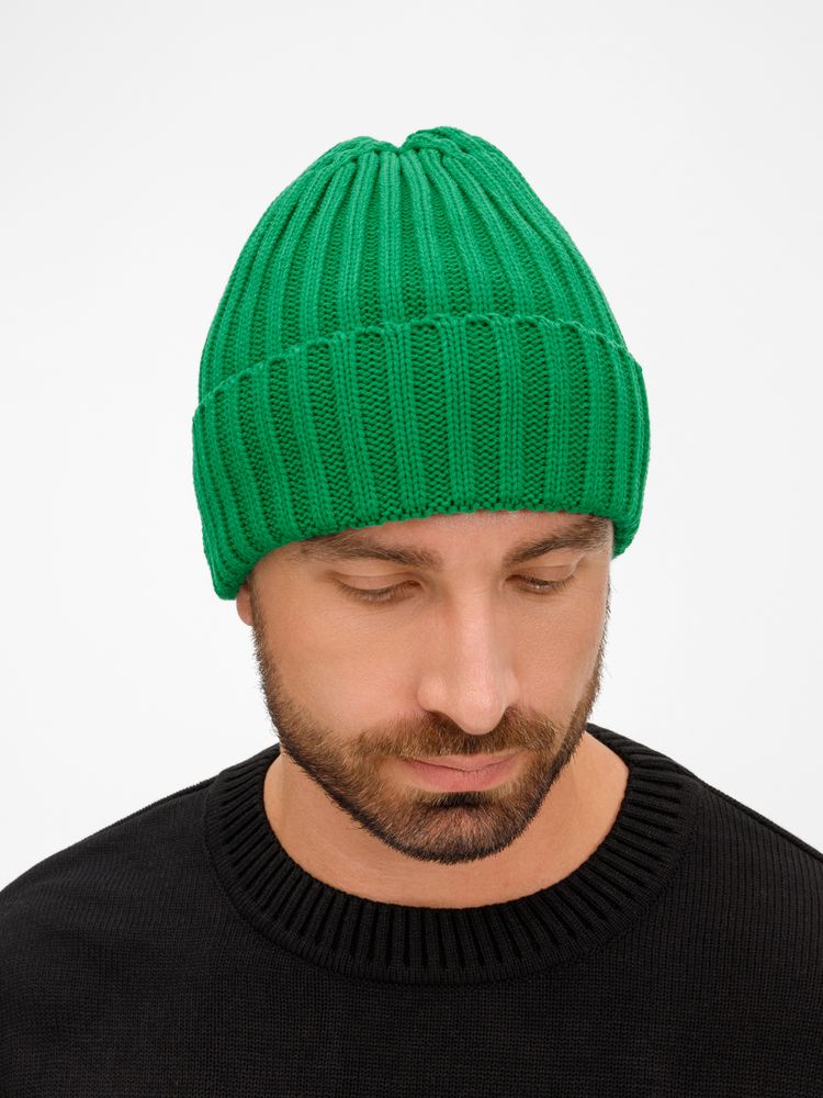 Однослойная шапка рельефной вязки с отворотом.