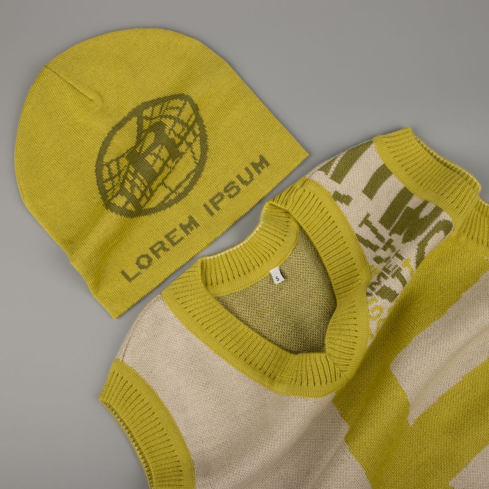 Шапка с вывязанным логотипом и индивидуальным рисунком в фирменной цветовой гамме.