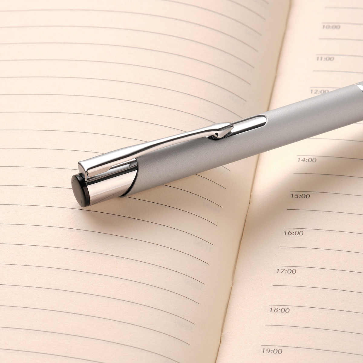 Классическая ручка в шелковистом покрытии Soft Touch станет прекрасным инструментом для письма. Хромированные детали – два декоративных кольца и функциональный надежный клип.