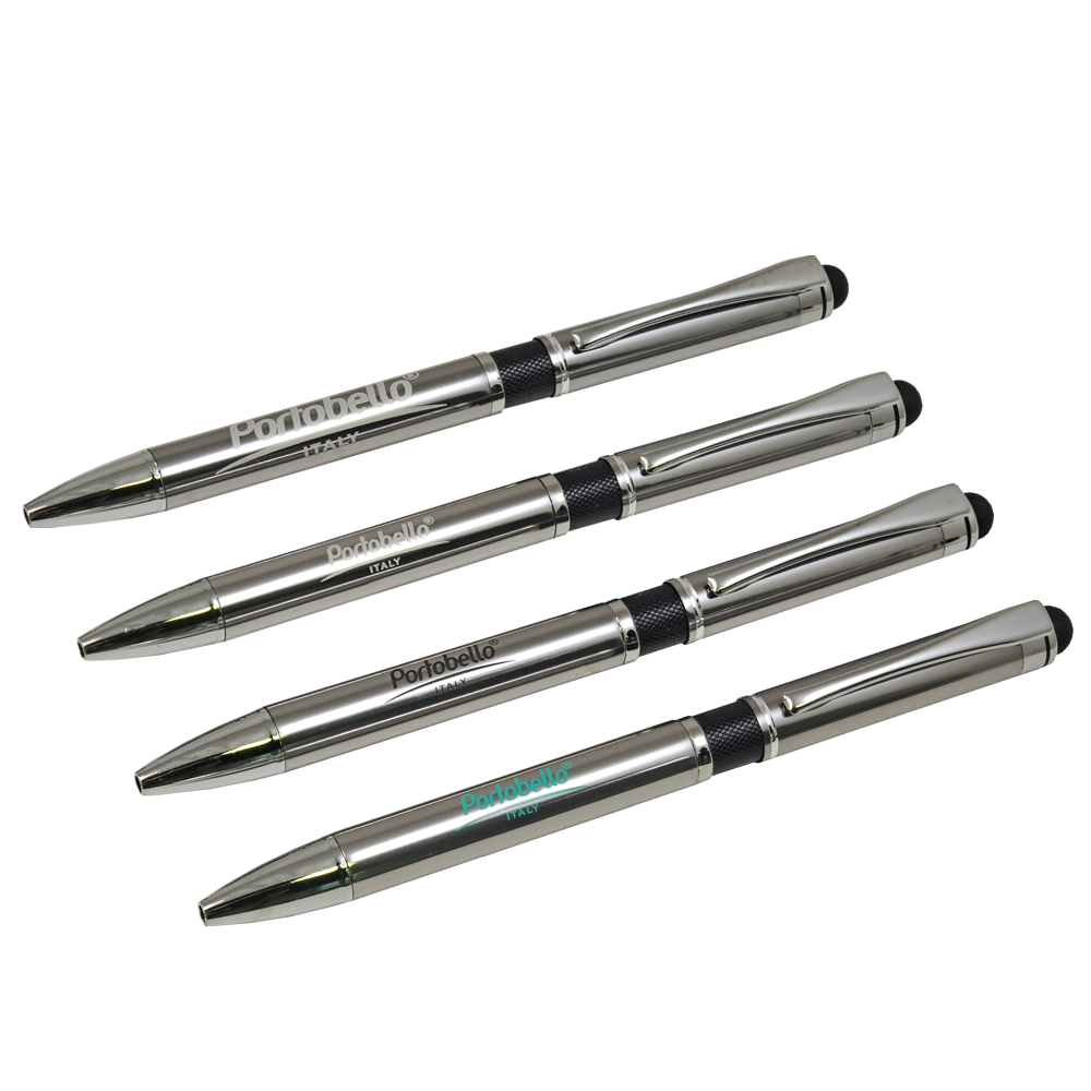 Классическая ручка цвета металлик с цветными деталями. Оснащена стилусом для работы с сенсорными экранами.