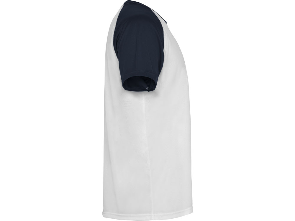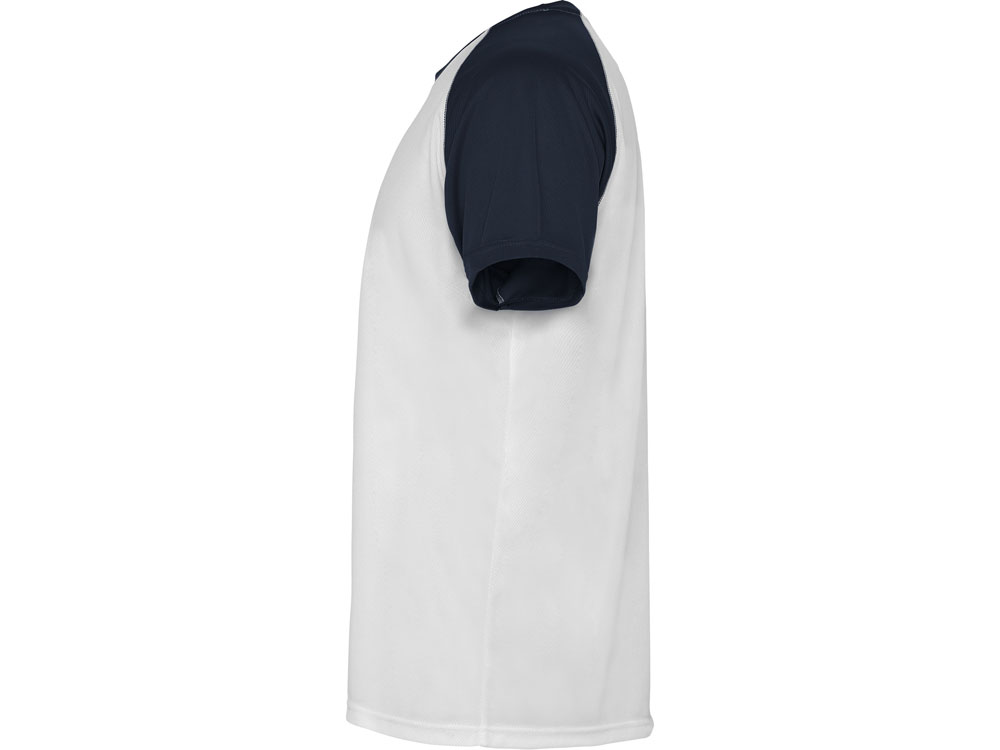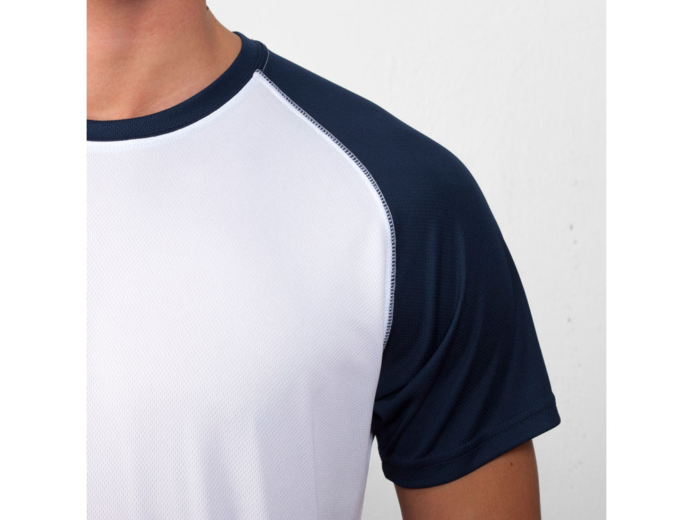 Спортивная футболка с контрастным рукавом реглан. Круглый вырез горловины с контрастной тесьмой. Технологическое дышащее полотно.