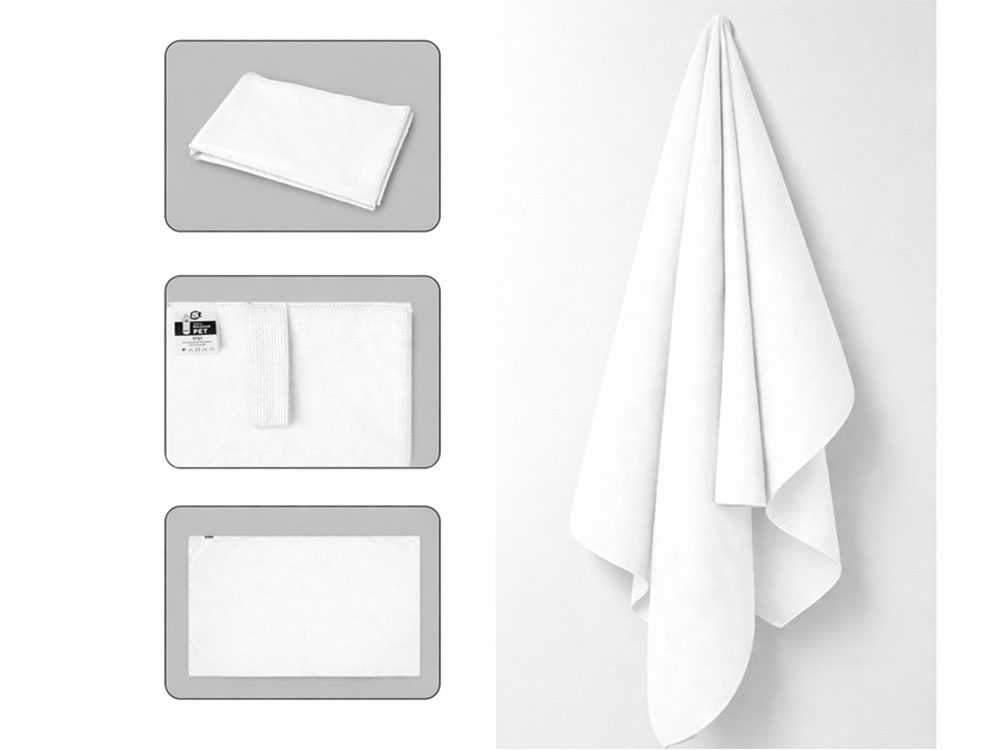 Легкое полотенце из микрофибры, изготовленное из переработанного ПЭТ, с ремешком для складывания и удобной транспортировки.
