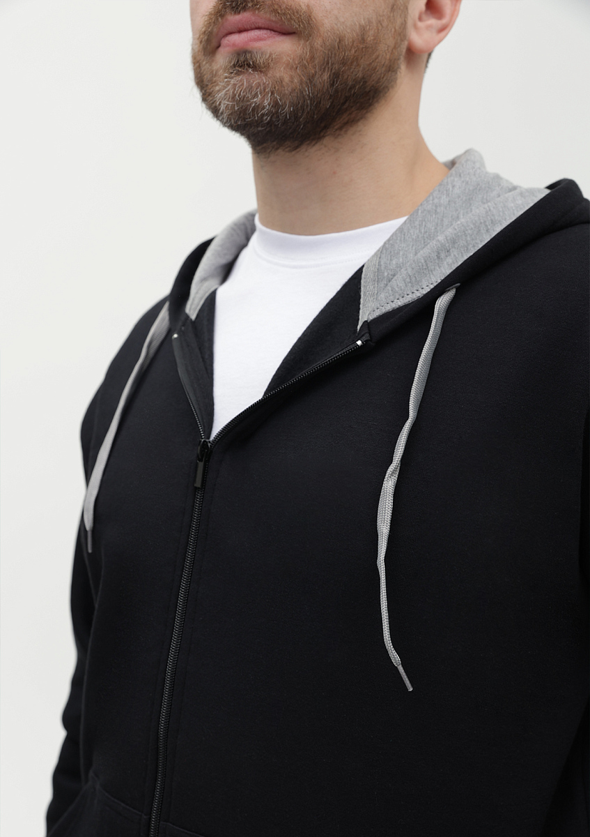 Мужская толстовка прямого силуэта с капюшоном комфортной глубины, втачным рукавом и накладным карманом. Капюшон дополнен шнурком для регулирования прилегания, манжет и низ изделия оформлены широкой эластичной резинкой.
