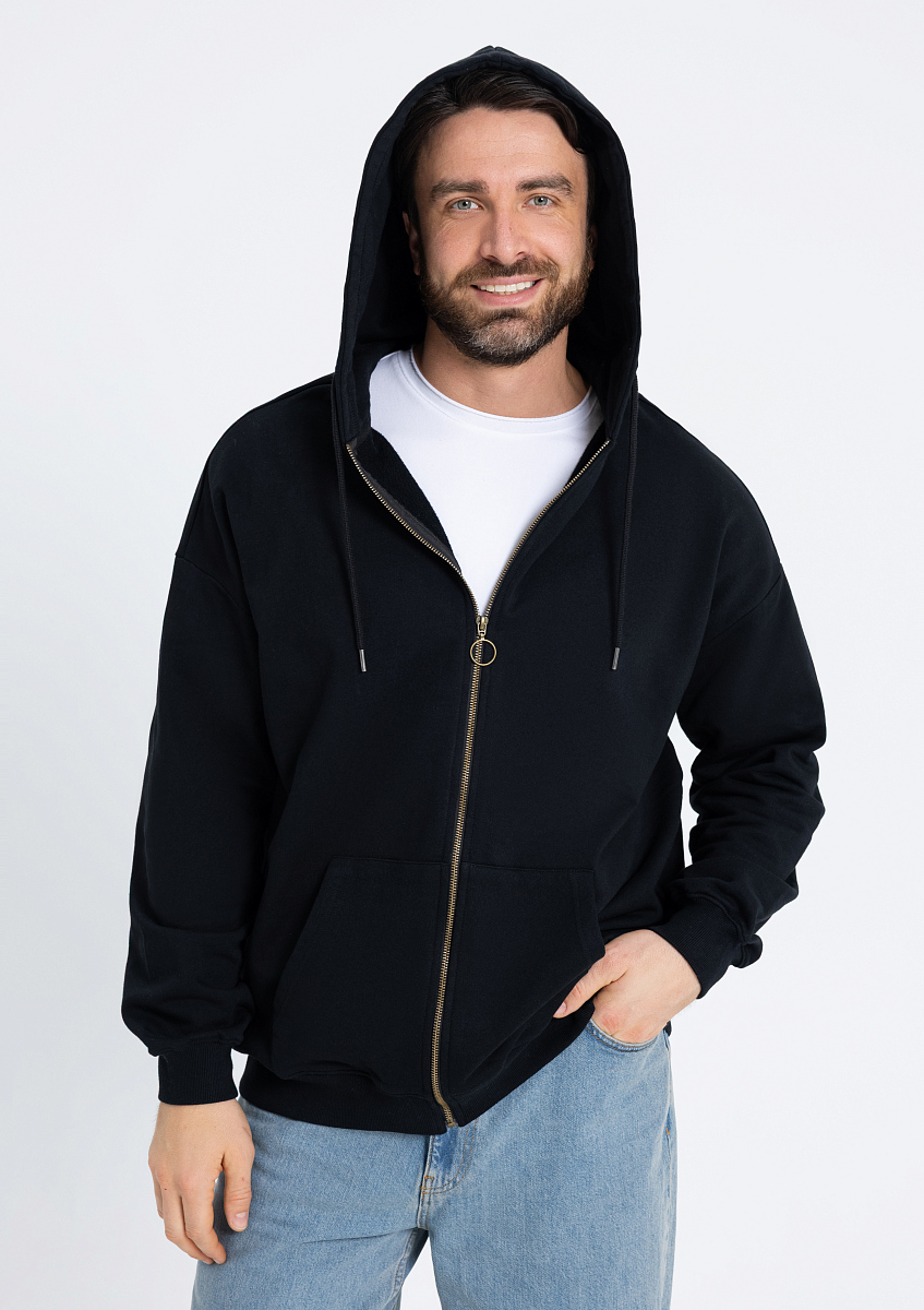 Толстовка силуэта oversize с капюшоном комфортной глубины, спущенной линией плеча и глубоким карманом. Крой дополнен акцентной молнией, а горловина и спинка модели укреплены киперной тесьмой.