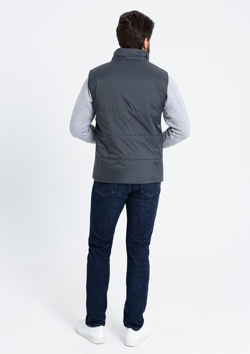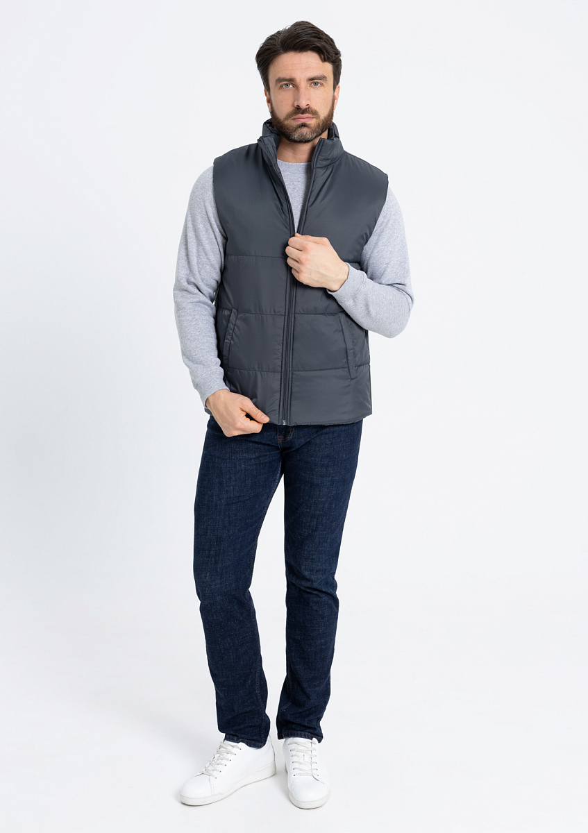 Универсальный жилет прямого силуэта с широкой горизонтальной стежкой, высоким воротником-стойкой, глубоким прорезным карманом и застежкой на молнию. Благодаря классическому лаконичному крою модель станет стильным дополнением как к мужскому, так и к женскому гардеробу.