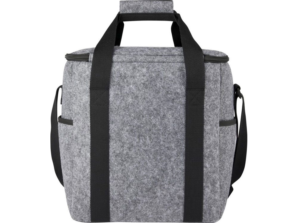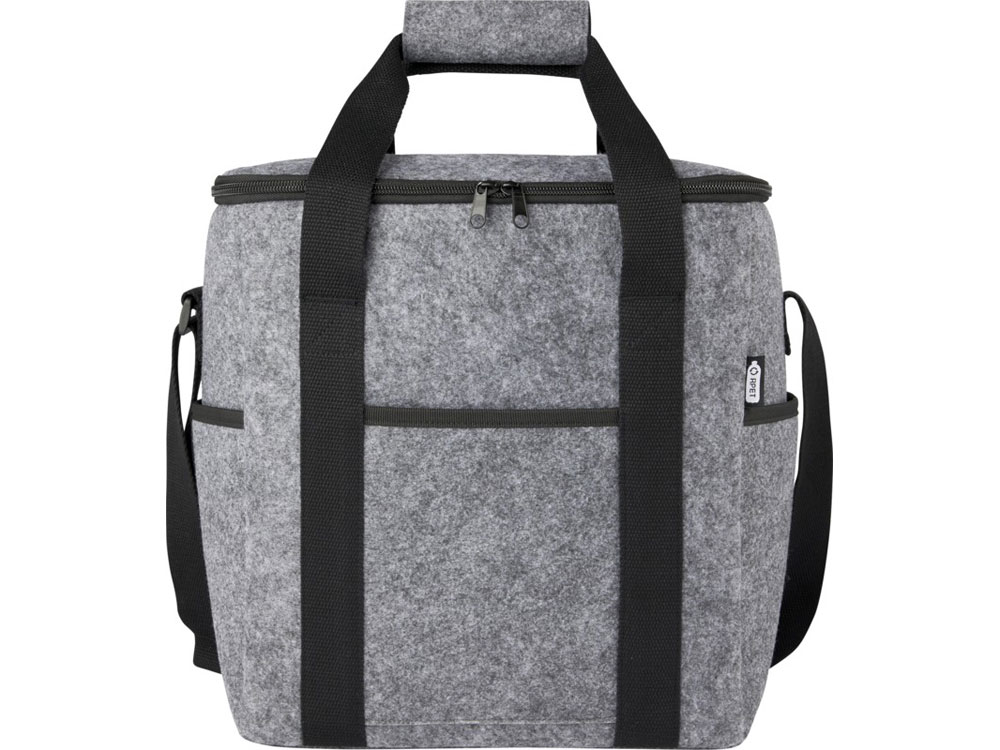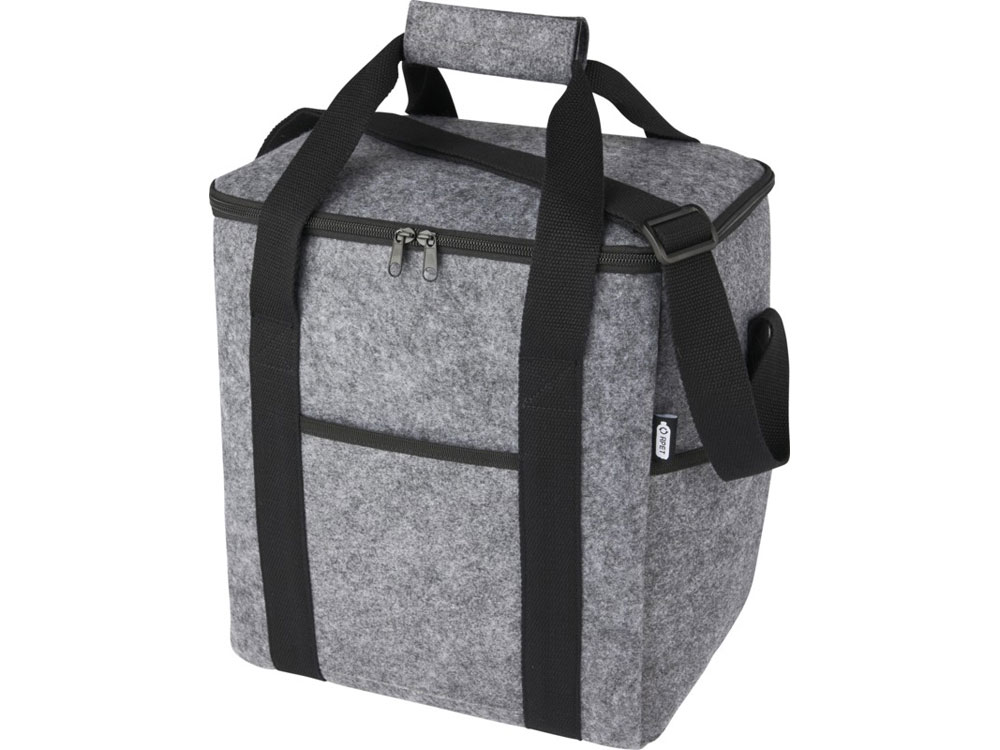 Большая сумка-холодильник, изготовленная из высококачественного мягкого и прочного фетра, переработанного по стандарту GRS. Имеет большое главное отделение (на шесть бутылок 1,5 л), отделанное высокоплотной термической PEVA-изоляцией, совместимой с пищевыми продуктами, позволяющей хранить напитки и закуски холодными на протяжении нескольких часов. Верхняя часть с застежкой на молнии, передний карман и два боковых кармана для дополнительной вместимости. Длинные регулируемые тканые плечевые ремни из хлопка (55 x 3,8 см) и 2 тканых хлопковых ручки для переноски (25 x 3,8 см) с верхней застежкой на липучке. Легко чистится. Емкость: 21 литр.