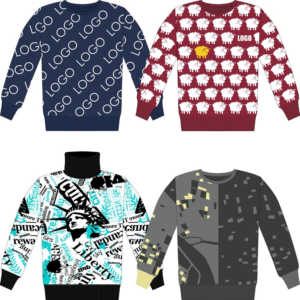 Свитер с вывязанным логотипом и индивидуальным рисунком в фирменной цветовой гамме.