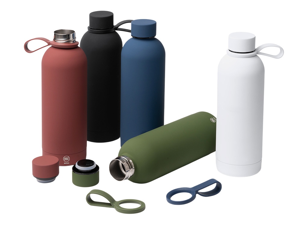 Термобутылка из переработанной нержавеющей стали 304. Мягкая прорезиненная поверхность на корпусе. Удобная силиконовая ручка для переноски. Оснащена противокапельной системой благодаря силиконовому кольцу, встроенному во внутреннюю часть крышки. Крышка и ручка соответствуют цвету корпуса. Объем: 500 мл.