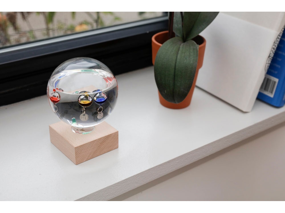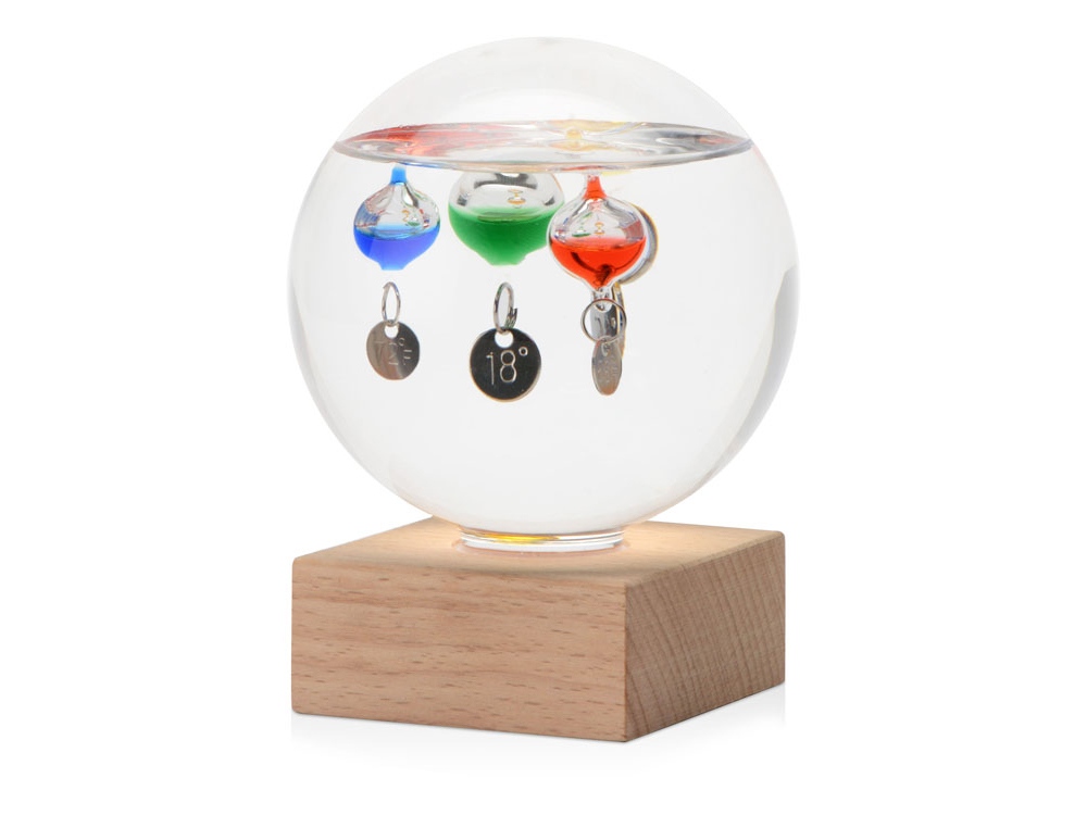 Термометр не только очаровательно выглядит, но и действительно функционирует как градусник внутри помещения с комнатной температурой. Определять погоду по нему очень просто: посмотрите, какой из стеклянных буйков находится ниже всего, именно такова температура окружающей среды. В основе действия этого круглого стеклянного термометра – принцип действия реально существовавшего и популярного в свое время термометра Галилея, который представлял, правда, не шарик, а высокую колбу с такими же стеклянными буйками, в каждом из которых – жидкость разной плотности. На каждом из буйков висит табличка с температурой, указанной в градусах Цельсия и Фаренгейта. Не укатиться шарику помогает деревянная подставка.
