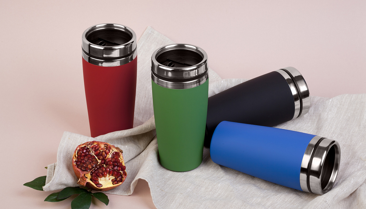 Внешняя стенка термостакана изготовлена из нержавеющей стали с уникальным прорезиненным напылением soft-touch, а внутренняя стенка выполнена из высококачественной пищевой, нержавеющей стали. Корпус изделия персонализируется по окружности встык. У термостакана отвинчивающаяся крышка.