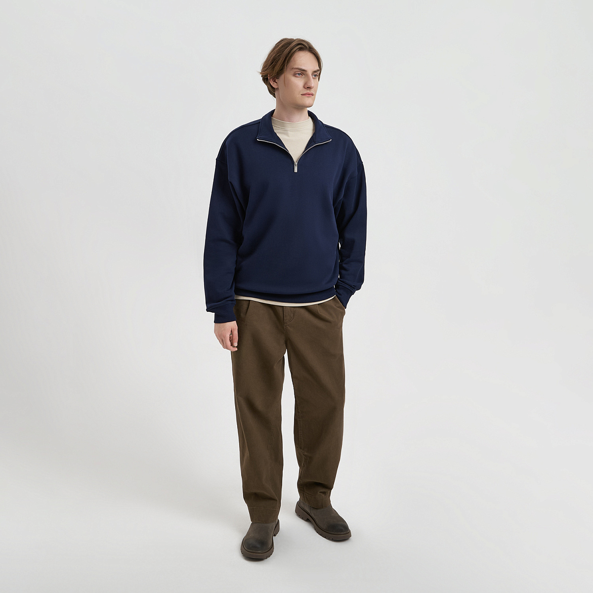 Универсальная толстовка с воротником-стойкой и заниженной линией плеча. По нижнему краю и на рукавах — эластичные резинки для комфортной и аккуратной посадки. Модель застёгивается на металлическую молнию.