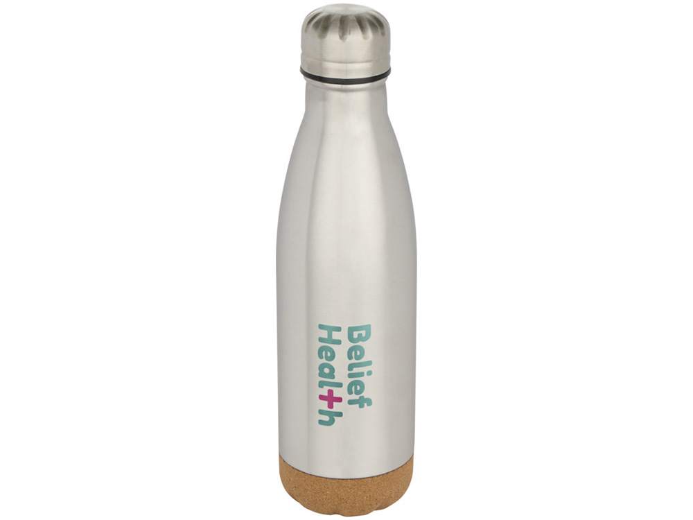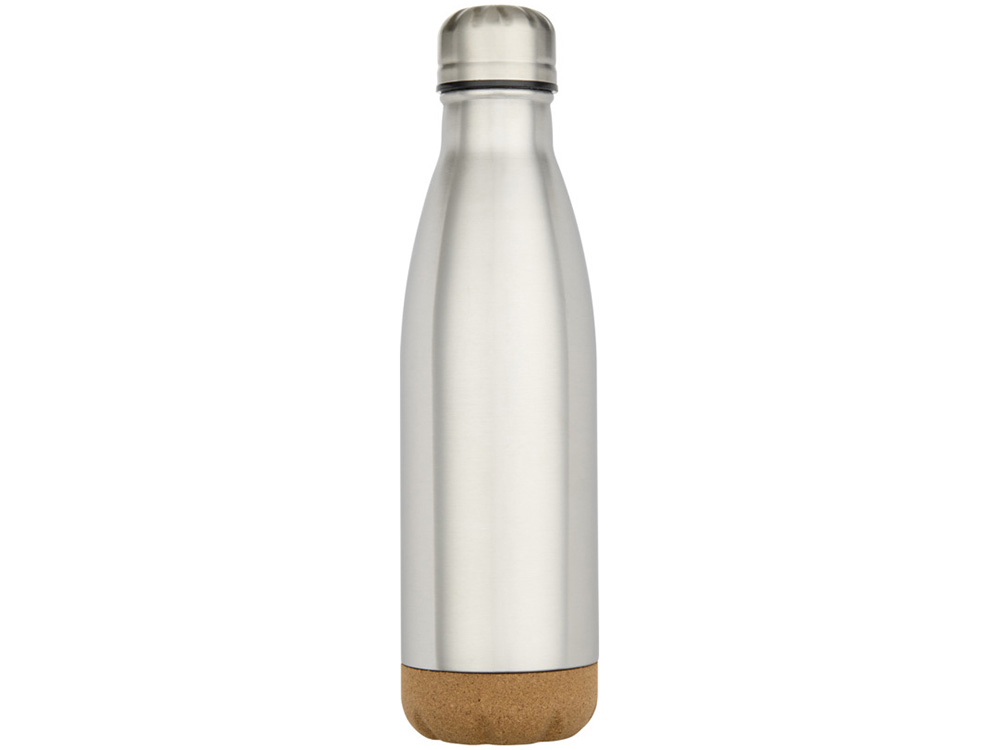 Бутылка для воды из нержавеющей стали с вакуумной изоляцией и пробковыми деталями в нижней части. Двойная изоляция стенок сохраняет напитки горячими или холодными в течение нескольких часов. Поставляется в подарочной коробке из переработанного картона. Объем: 500 мл. 90% нержавеющая сталь, 10% Пробка. упаковка FSC Mix Credit P5.1 CU-COC-877277.