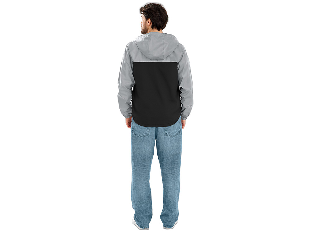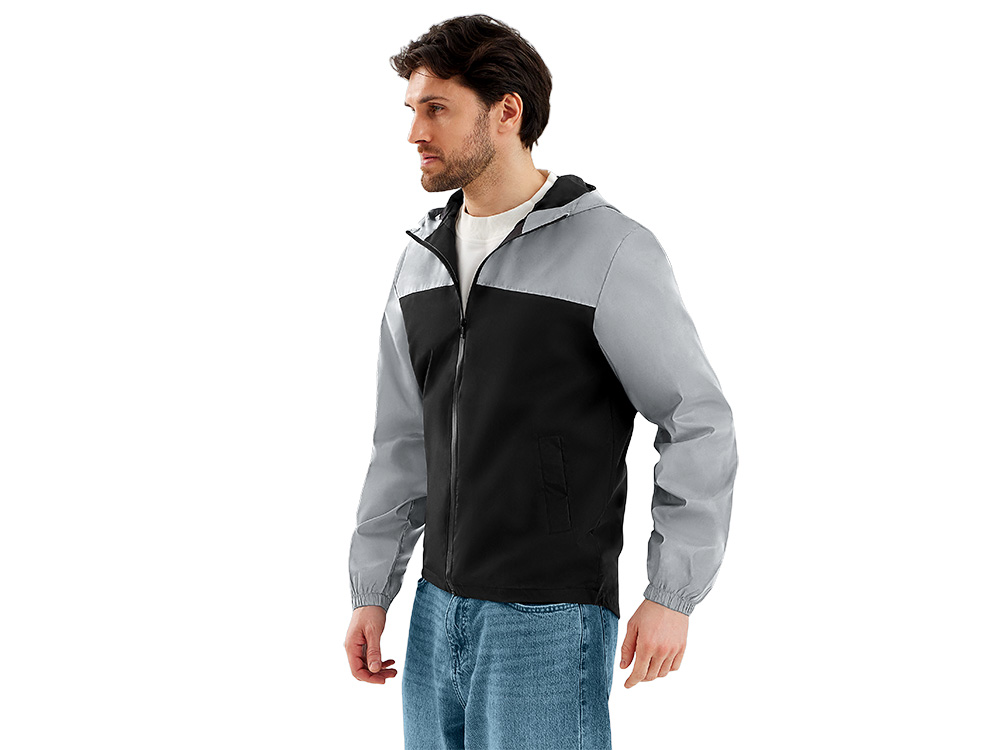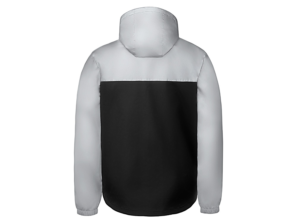 Streetwear-ветровка с контрастным дизайном: верх переда и спинки, рукава и капюшон — из светоотражающей ткани, низ — из прочной чёрной полиэстеровой ткани. Модель на подкладке, со спинкой длиннее переда.