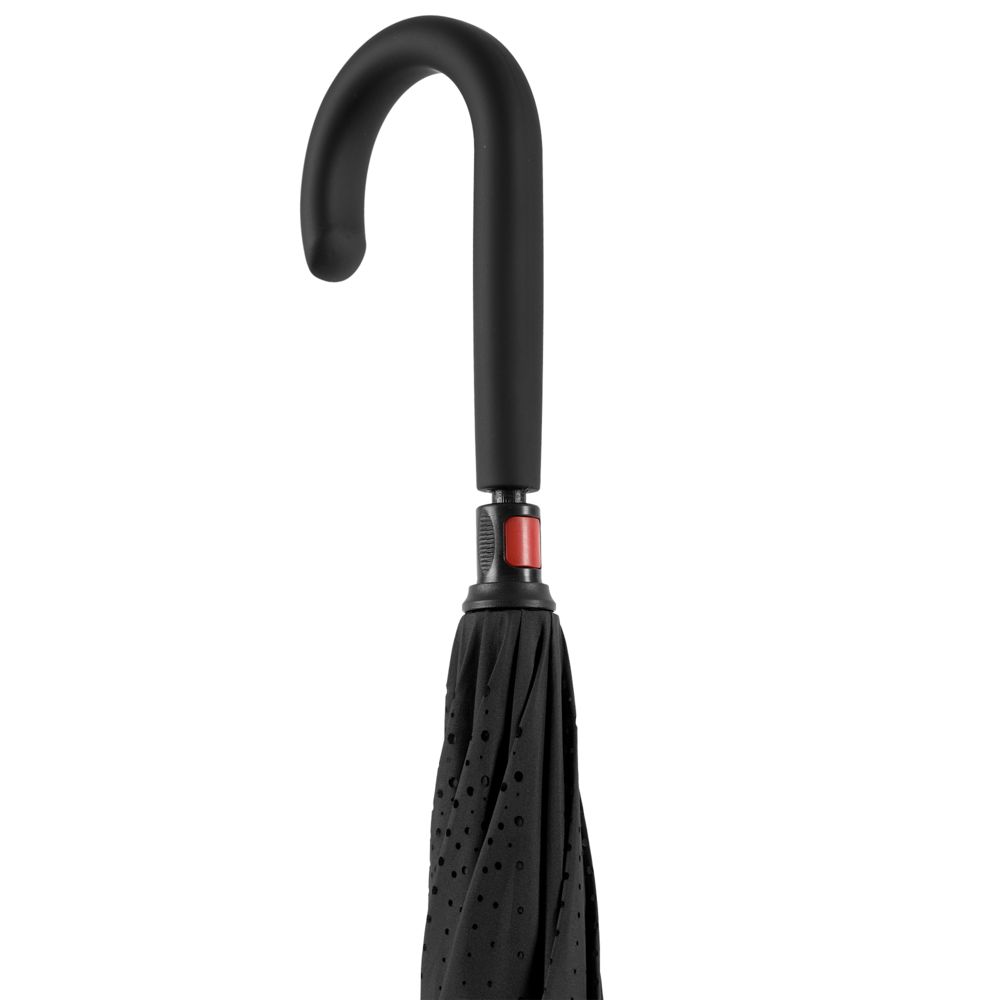 Это зонт-наоборот, зонт-наизнанку. Складываясь после дождя, он прячет мокрую поверхность в себя, а сухая остается снаружи. Для просушки его можно не только подвесить за ручку, как обычные зонты, но и поставить прямо на пол в полусложенном состоянии. Итог — мягкая щадящая просушка и минимум занятого мокрым зонтиком места.