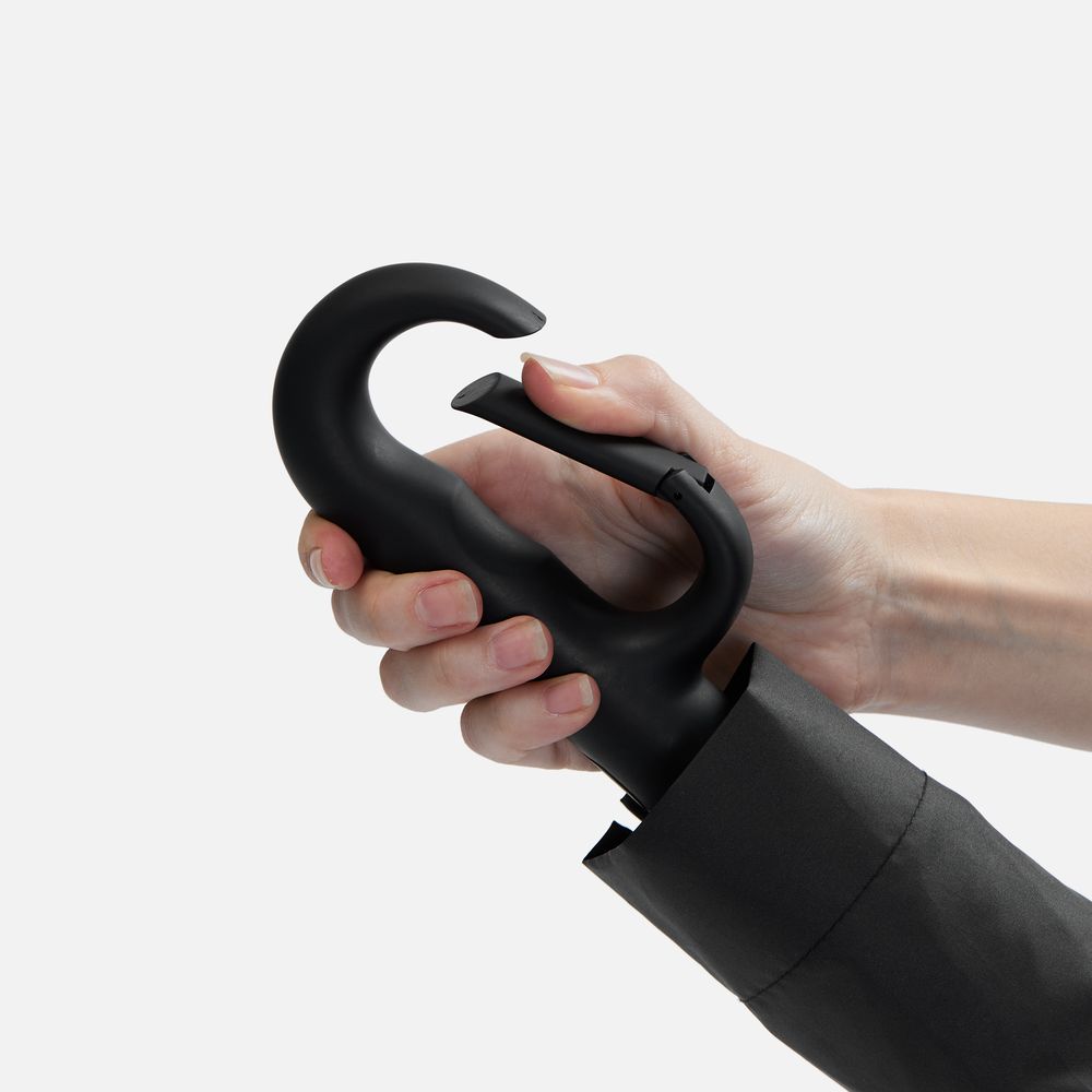 Преимущество обратного сложения заключается в том, что при закрытии внутренняя поверхность зонта остается снаружи, а мокрая сторона — внутри. За ручку-карабин удобно подвесить зонт на рюкзак или сумку.