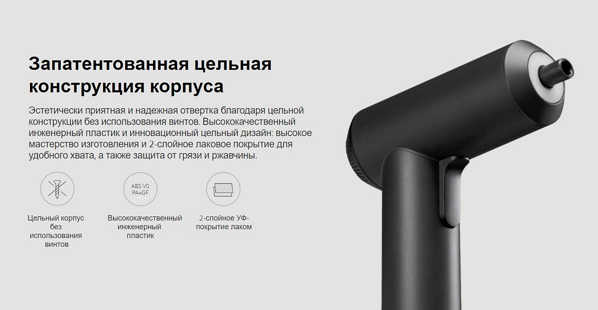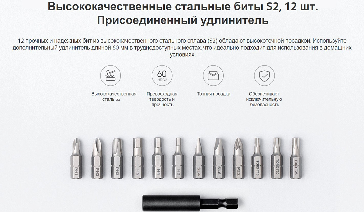 Особенности: цельная конструкция без использования винтов; высокий крутящий момент 5 Н·м; аккумулятор повышенной емкости 2000 мАч позволяет закрутить до 180 винтов или шурупов на одной зарядке; 12 прочных и надежных бит из высококачественного стального сплава (S2) обладают высокоточной посадкой; дополнительный удлинитель длиной 60 мм в труднодоступных местах, что идеально подходит для использования в домашних условиях; встроенное хранилище бит; подсветка рабочей зоны; футляр для хранения
