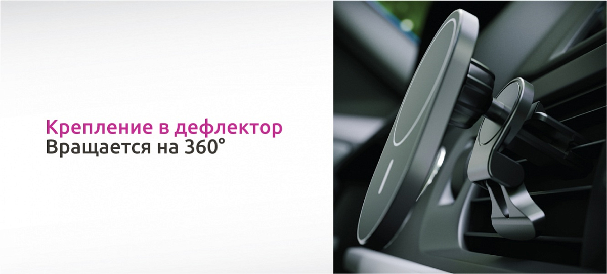 Особенности: магнитная фиксация смартфона, монтаж в дефлектор, работа с устройствами без технологии MagSafe, 15 Ватт мощности зарядки