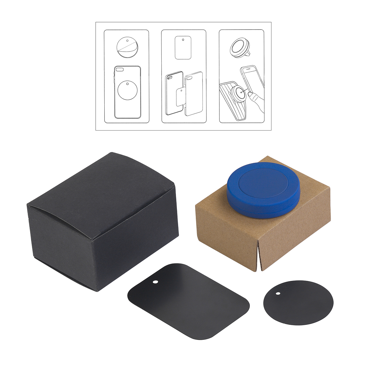 Магнитный держатель используется вместе с ответной металлической пластиной, которая крепится к корпусу устройства (непосредственно на сам смартфон, либо чехол или бампер) на двусторонний скотч (3M).
