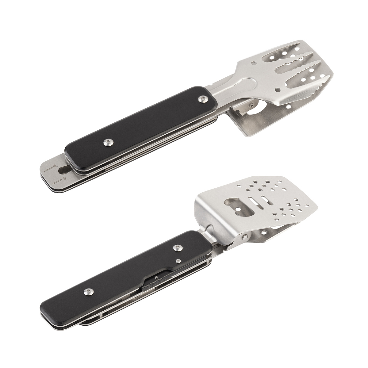 4 аксессуара: лопатка, вилка, щипцы и открывашка в одном инструменте. Размер в сложенном виде всего 6 х 22,5 х 2,6 см, в комплекте есть чехол из хлопка для хранения.