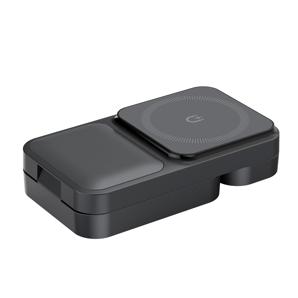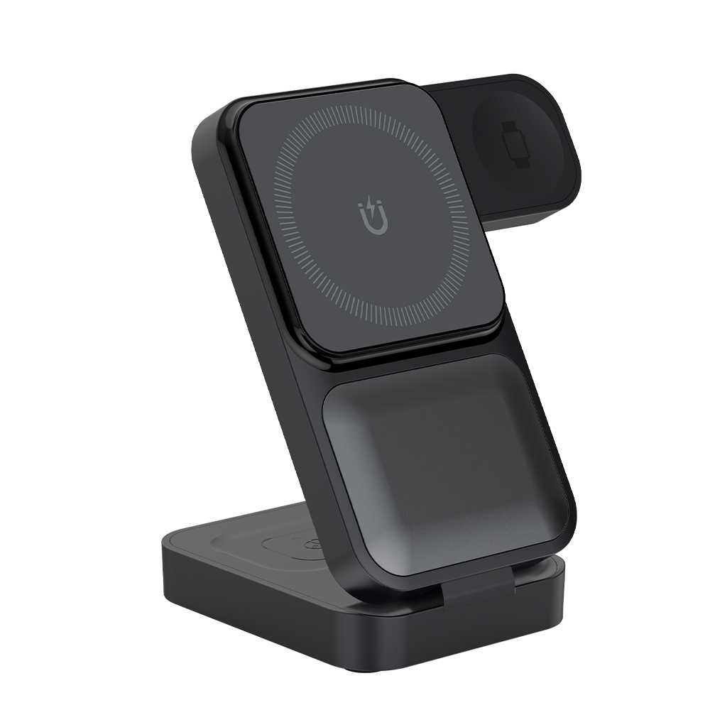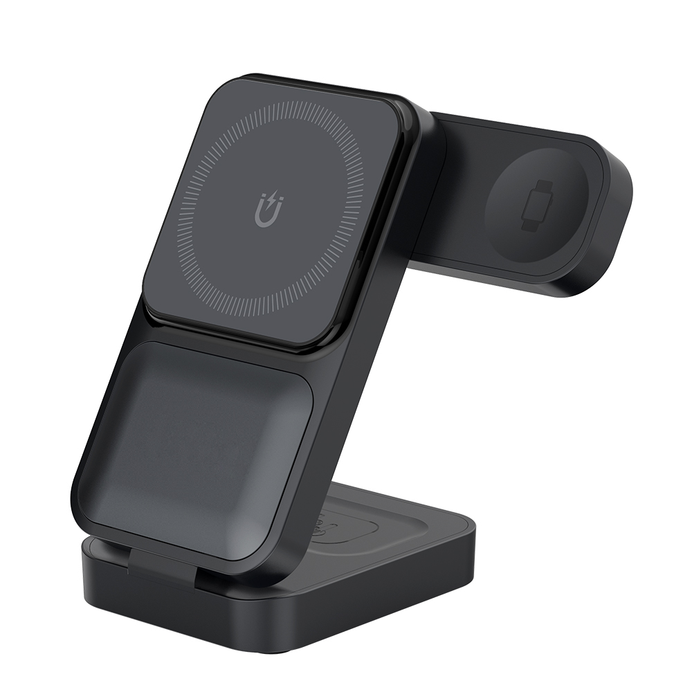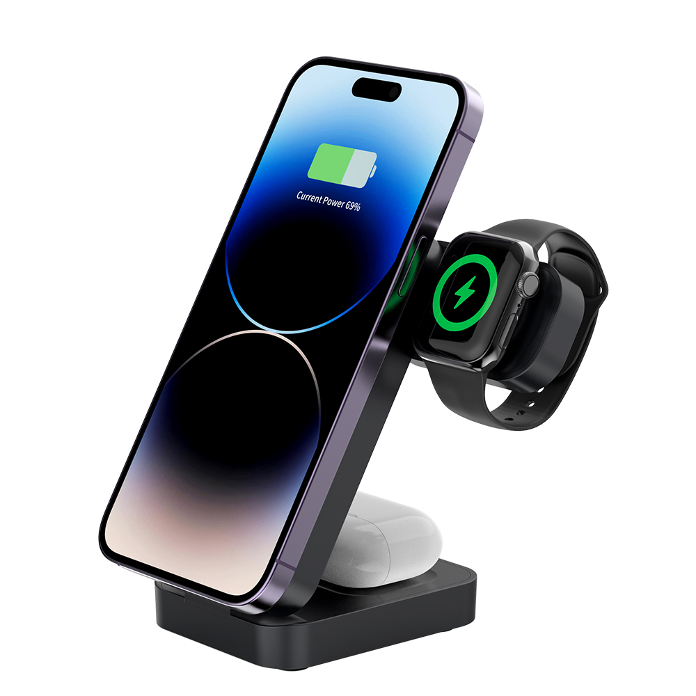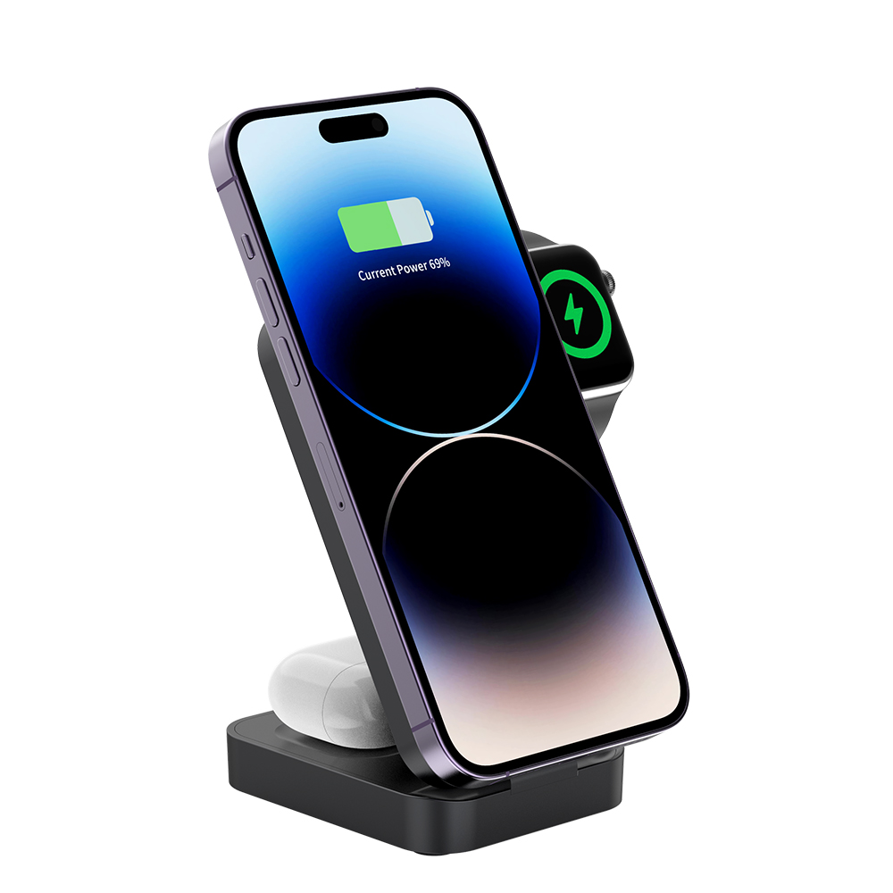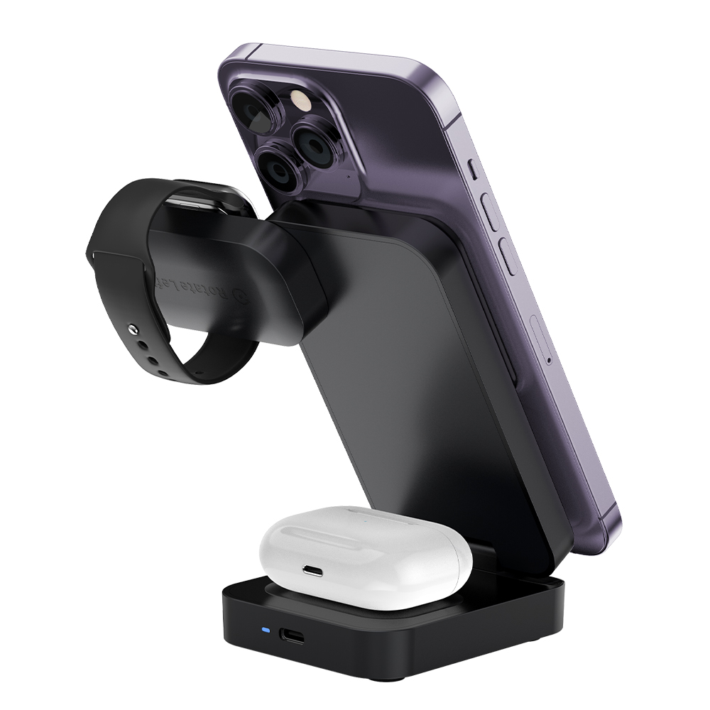 Особенности: БЗУ совместимо со смартфонами поддерживающими технологию MagSafe, включая iPhone серии 12 и выше, а также с AirPods с поддержкой беспроводной зарядки и Apple Watch. Также зарядное устройство поддерживает вертикальную или горизонтальную зарядку смартфона. Максимальная мощность зарядки для смартфонов может достигать 15 Вт, для Apple Watch — 2,5 Вт.