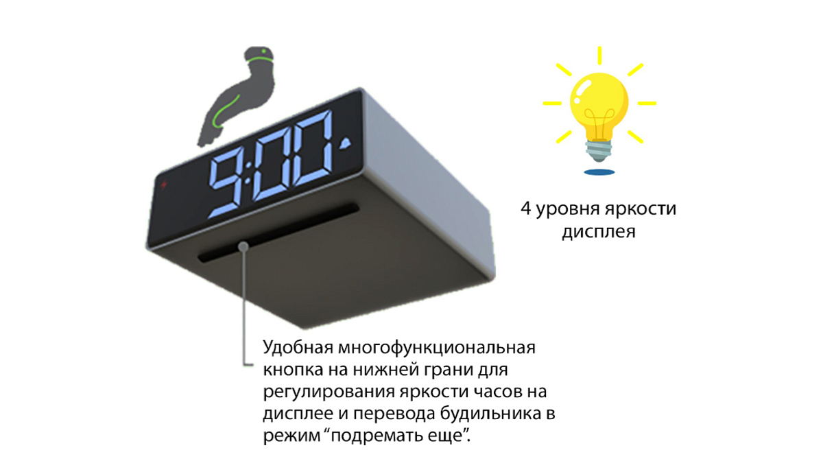 Особенности: стиль хай-тек; автоматическое снижение яркости ночью; четырёхступенчатая регулировка яркости; будильник; режим «подремать» SNOOZE; сохранение настроек часов и будильника при отключении питания