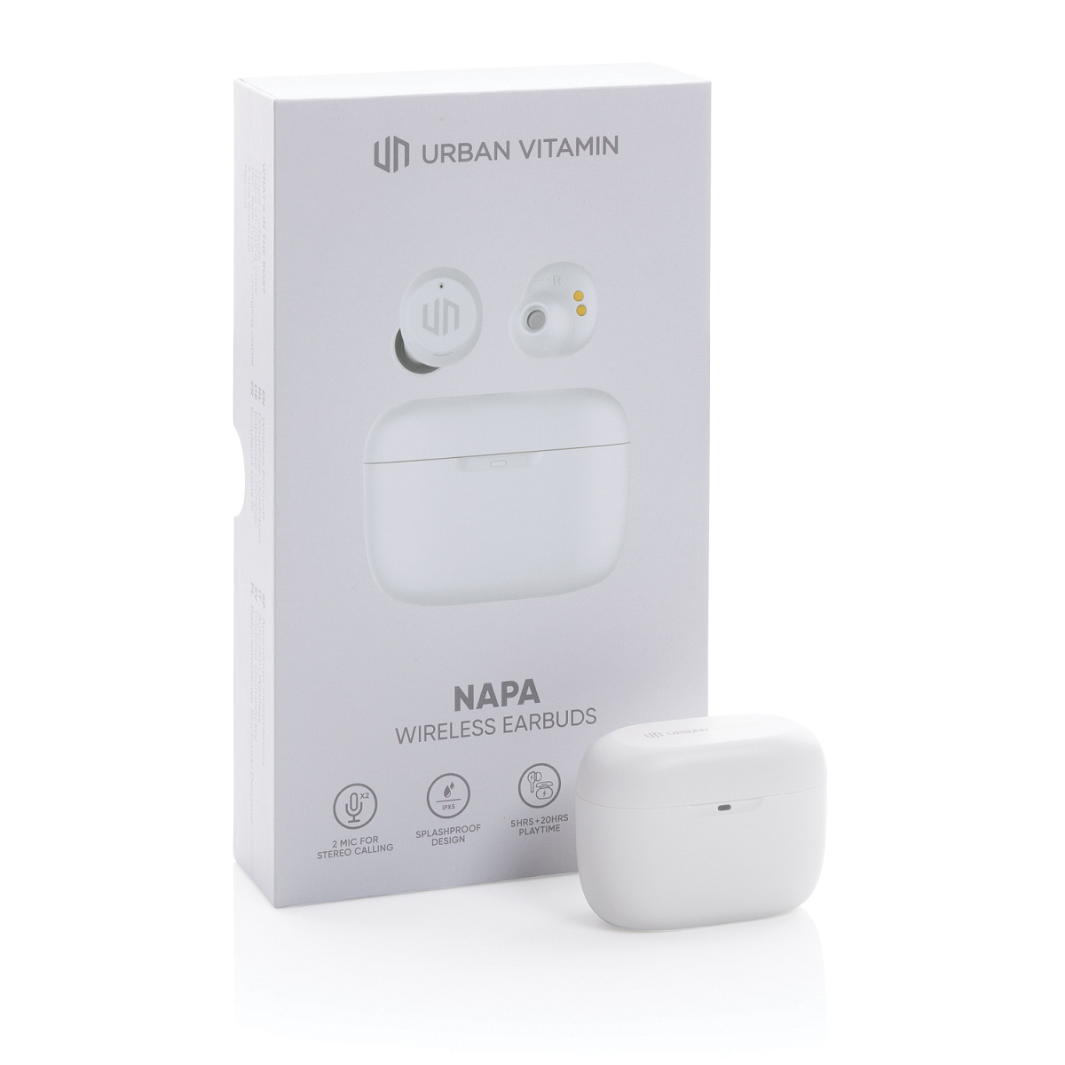 Готовы услышать по-настоящему мощные басы? Тогда наушники Napa от Urban Vitamin для вас! Невероятный звук в компактной упаковке. Стильные наушники работают до 5 часов без перерыва, после чего их легко подзарядить с помощью кейса, рассчитанного на 20 дополнительных часов. 2 встроенных микрофона обеспечивают безупречное звучание во время телефонных звонков. Просто коснитесь сенсора на наушнике, чтобы начать или завершить вызов. Степень защиты IPX 5 делает наушники устойчивыми к любым погодным условиям, поту и брызгам, поэтому они идеально подойдут для занятий спортом на свежем воздухе. Изделия Urban Vitamin не содержат ПВХ и упакованы без лишнего пластика. Длина 2,6 см., ширина 5,6 см., высота 3,9 см., диаметр 0 см.
