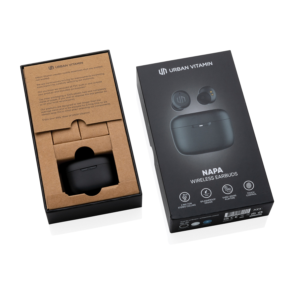 Готовы услышать по-настоящему мощные басы? Тогда наушники Napa от Urban Vitamin для вас! Невероятный звук в компактной упаковке. Стильные наушники работают до 5 часов без перерыва, после чего их легко подзарядить с помощью кейса, рассчитанного на 20 дополнительных часов. 2 встроенных микрофона обеспечивают безупречное звучание во время телефонных звонков. Просто коснитесь сенсора на наушнике, чтобы начать или завершить вызов. Степень защиты IPX 5 делает наушники устойчивыми к любым погодным условиям, поту и брызгам, поэтому они идеально подойдут для занятий спортом на свежем воздухе. Изделия Urban Vitamin не содержат ПВХ и упакованы без лишнего пластика. Длина 2,6 см., ширина 5,6 см., высота 3,9 см., диаметр 0 см.
