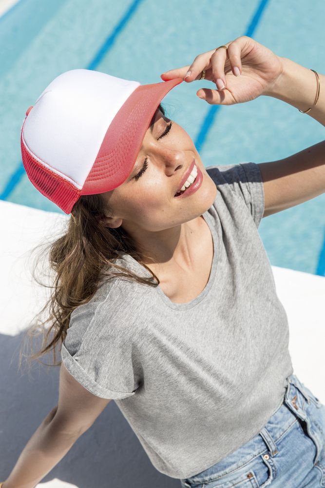 Бейсболка с 5 клиньями из сетки. Поролон в переднем клине (5 мм) и козырьке (3 мм). Регулируемая пластиковая застежка.
