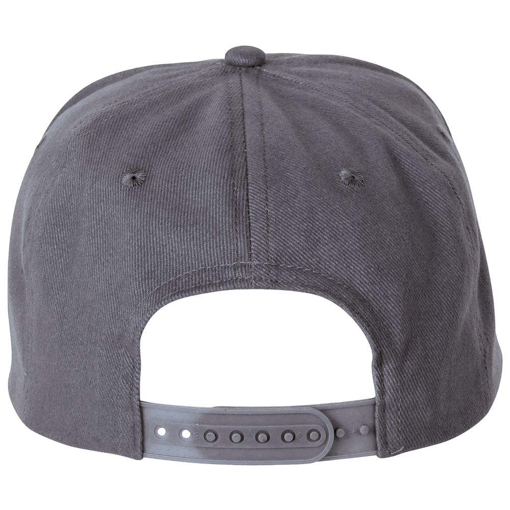 Однотонная бейсболка с 5 клиньями из материала, на ощупь напоминающего шерсть. Плоский козырек, 4 вышитых отверстия для вентиляции, регулируемая пластмассовая застежка сзади.