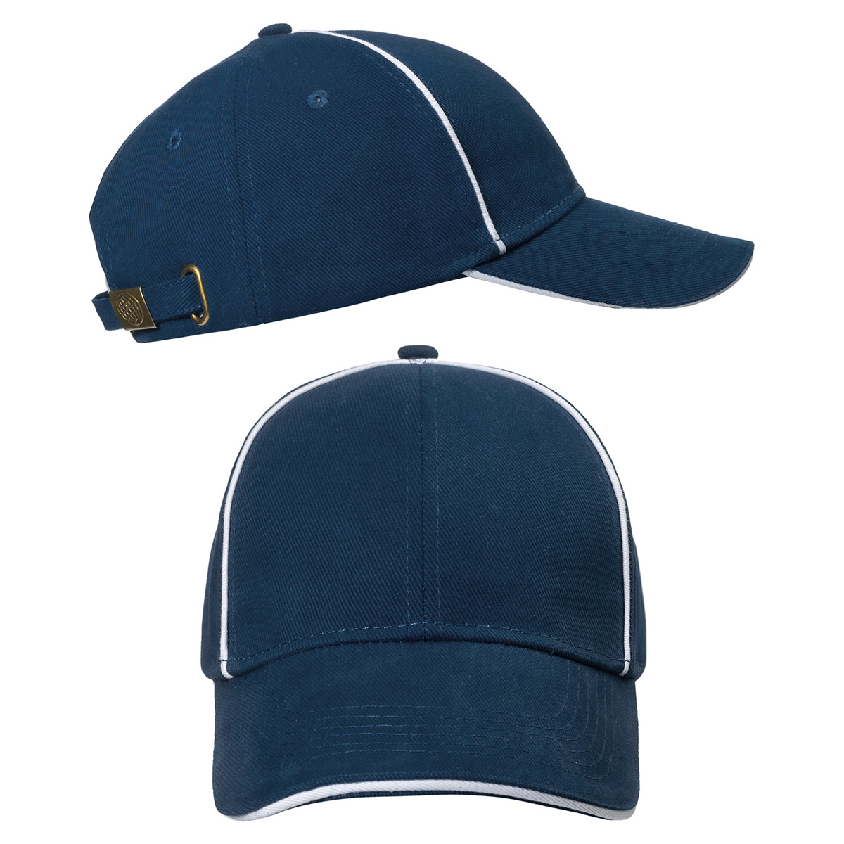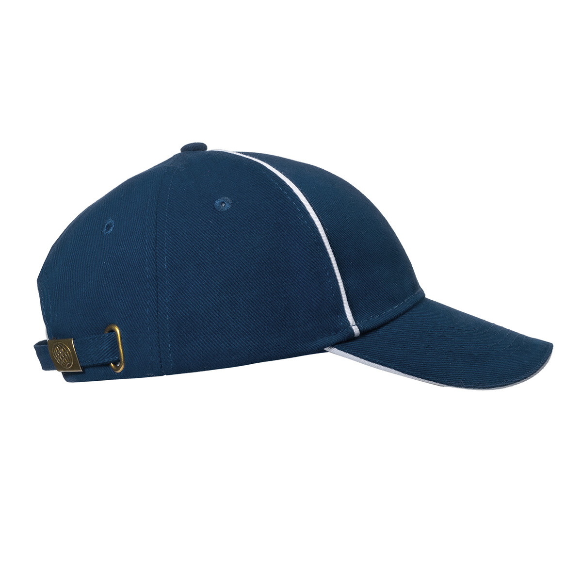 Шестиклинная модель с белой окантовкой козырька и краев лобовых клиньев. Велюровая. Размер (длина внутренней окружности/обхват головы): 54-61 см, регулируется планкой с металлической застежкой (латунь).