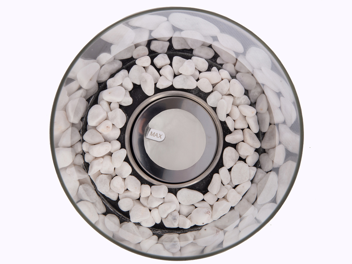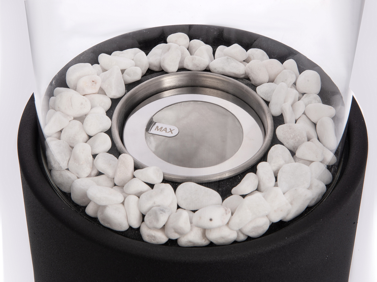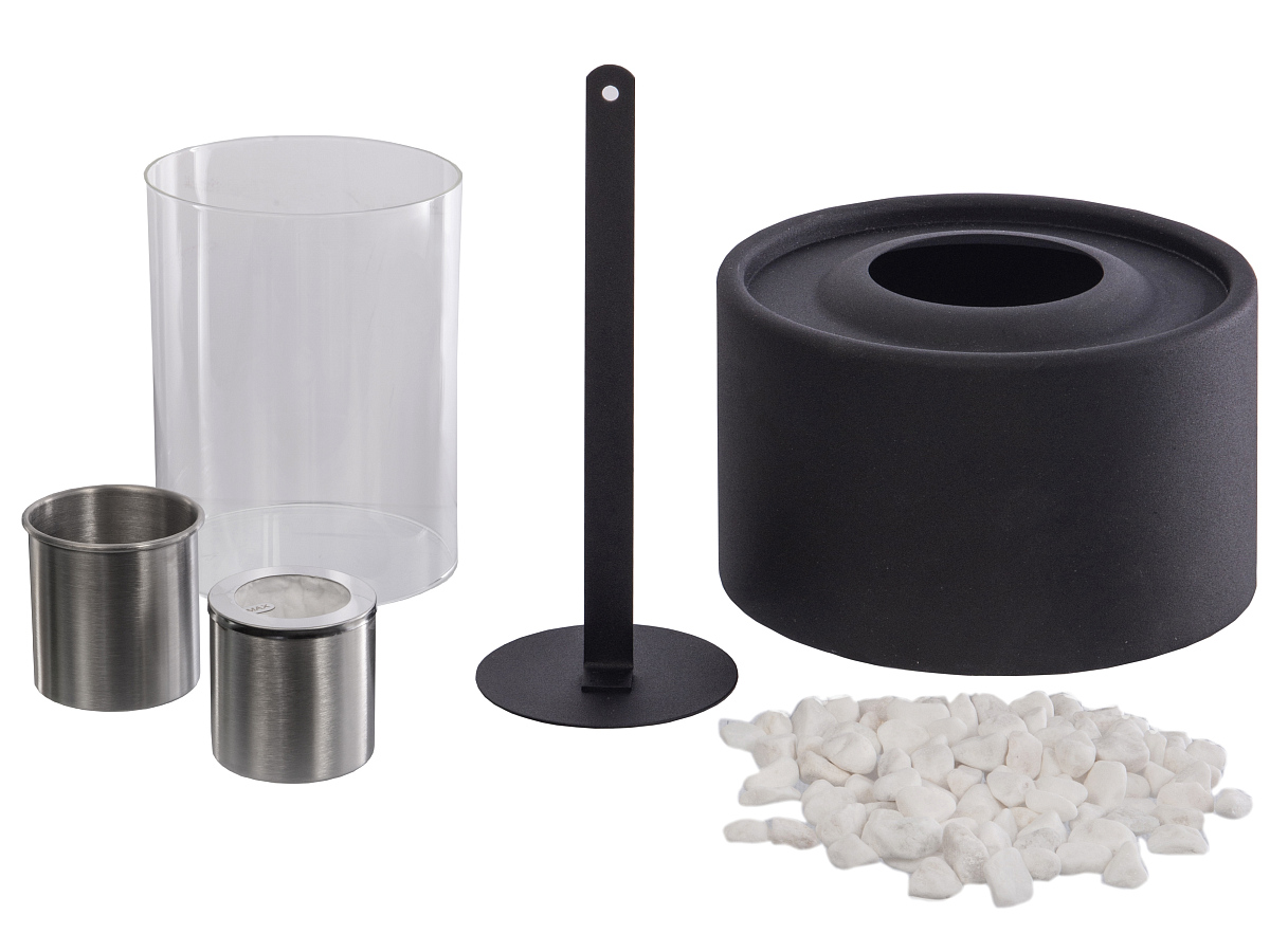 Комплектность: металлическая база, стеклянная колба, емкость для топлива, заглушка для тушения пламени, керамическая вата, декоративные камни