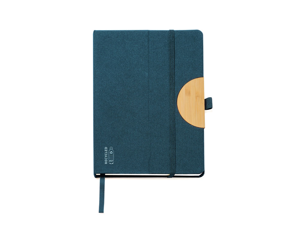 Блокнот формата А5 с жесткой обложкой из RPET с функцией подставки. Эластичная застежка, закладка и держатель для ручки. 80 листов.