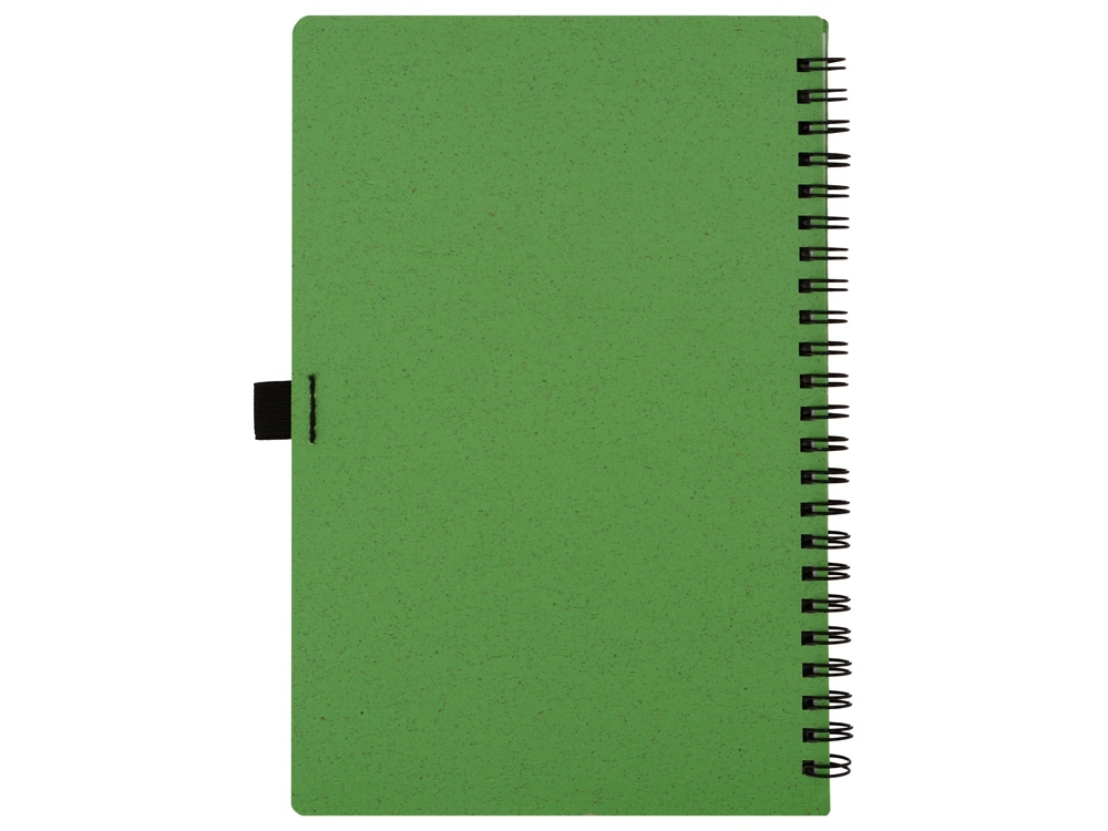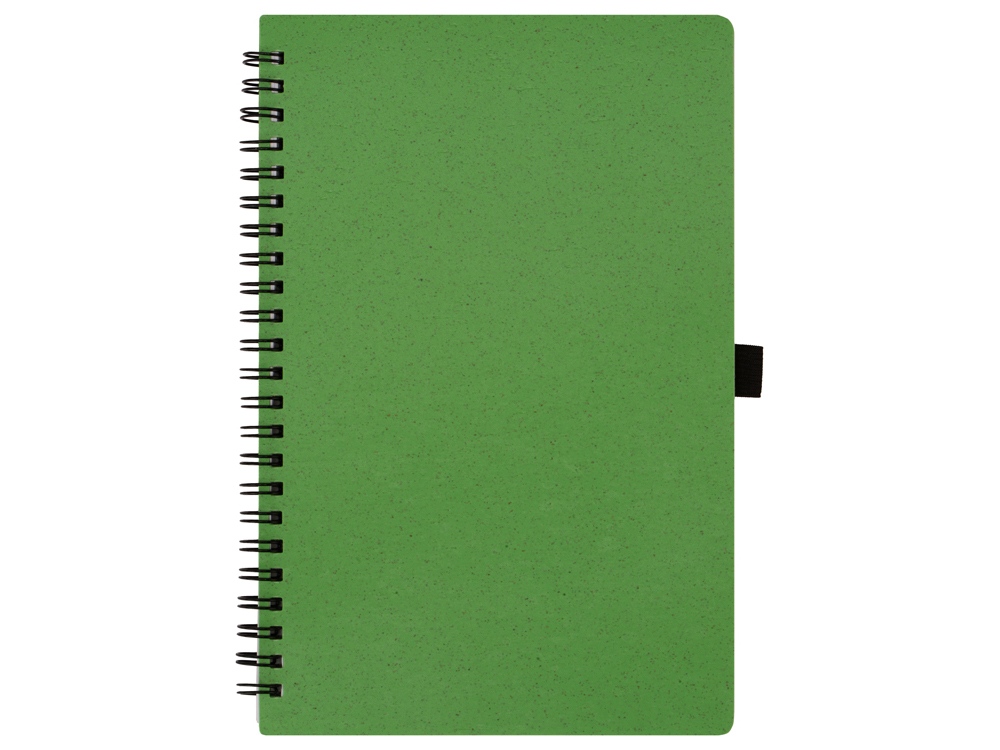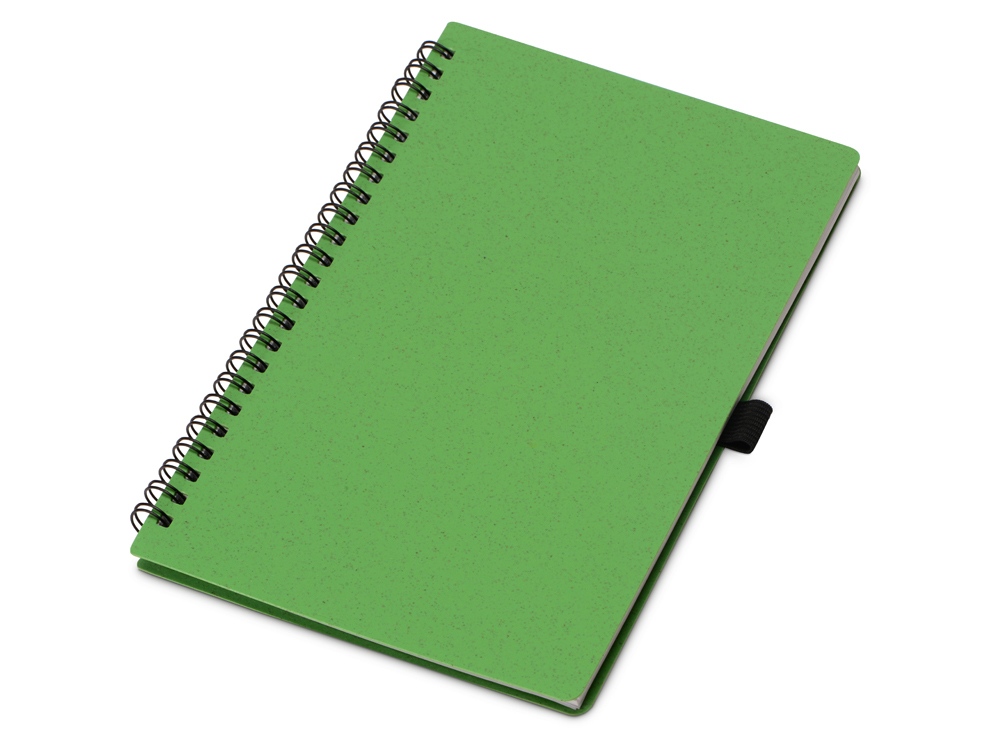 Блокнот с обложкой из переработанной пшеницы и пластика. Блок состоит из 70 листов переработанной бумаги белого цвета. Крепление - пружина. Дополнен петлей для ручки.