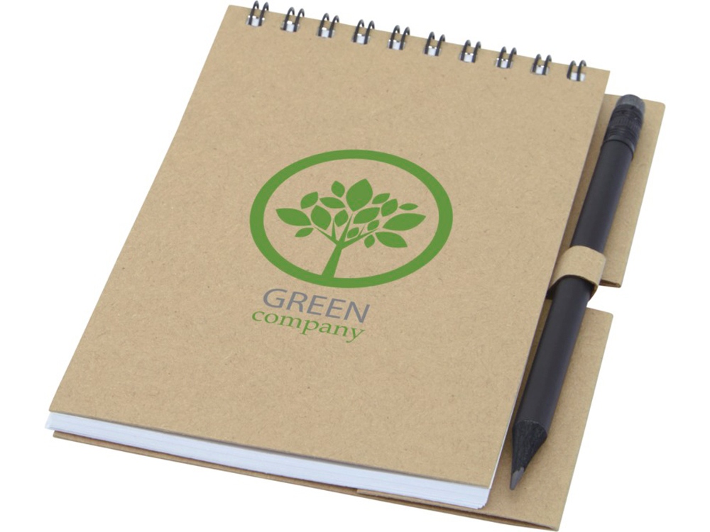 Блокнот на гребне из 40 листов плотностью 80 г/м², обложка и листы изготовлены из переработанной бумаги, соответствующей FSC, без декора. В комплект входит черный карандаш. Блокнот изготовлен в Италии.