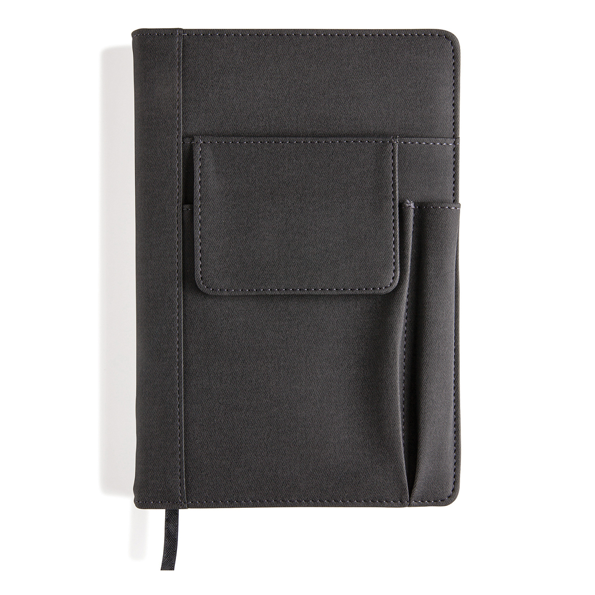 Тканевая обложка блокнота с передним отделением для телефона (14 х 10 см), с кармашком для пишущих принадлежностей и основным отделением для визиток или внешнего аккумулятора. Блокнот на 80 страниц, плотность бумаги 80 г/м2. После того как блокнот закончится, его легко поменять на новый. Длина 2 см., ширина 14,8 см., высота 21,8 см., диаметр 0 см.