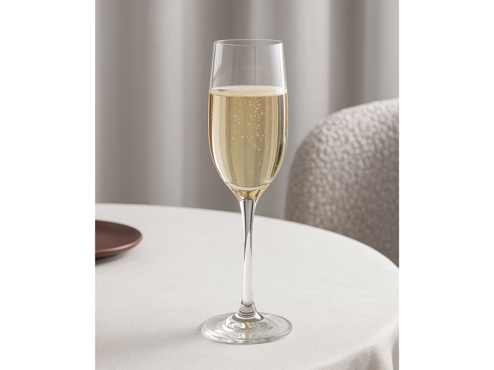 Классический бокал для шампанского выполнен из минерального стекла. Его легко мыть, он впишется в любой интерьер и сервировку, а также может стать частью вашего бара или ресторана. Форма этого бокала также называется флют — она специально рассчитана для игристых вин, не давая аромату слишком быстро улетучиваться вместе с пузырьками.