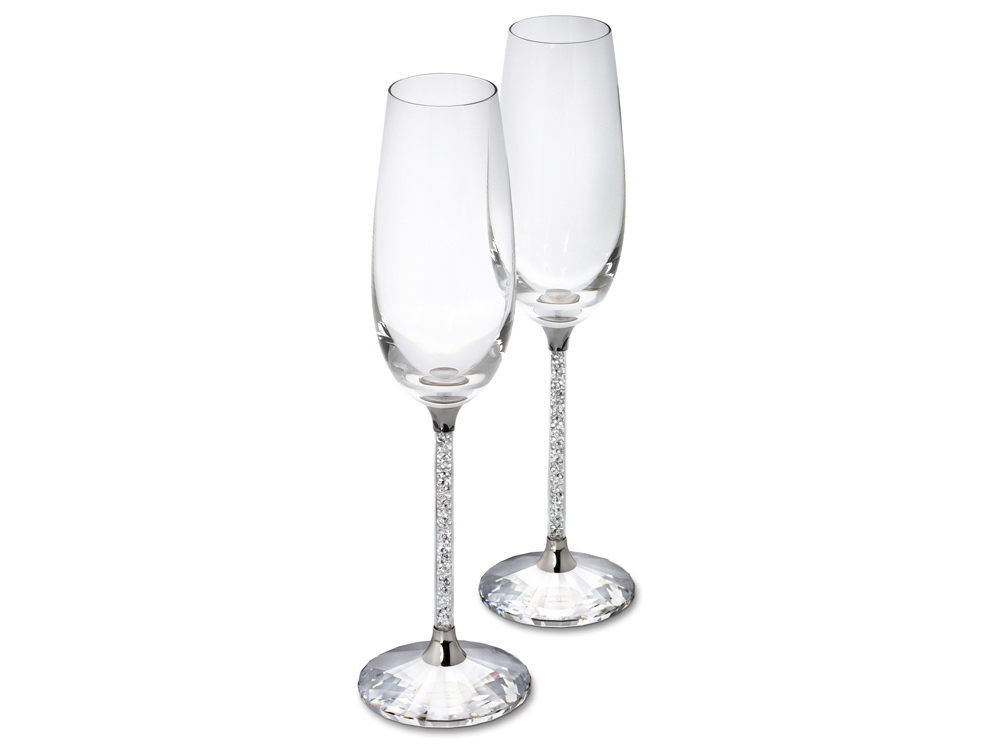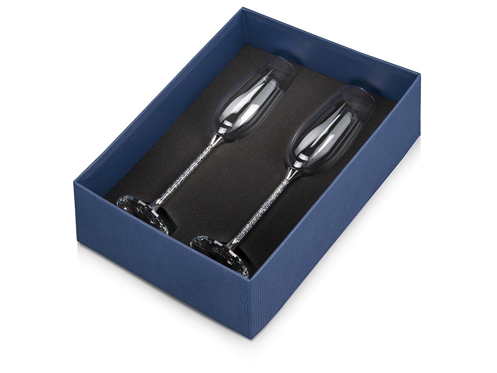 Набор из двух элегантных праздничных бокалов для шампанского сделает любой вечер романтичным и незабываемым. Ваш подарок долго будет ассоциироваться с особыми случаями. Тончайшее стекло, высокие ножки бокалов, наполненные прозрачными кристаллами, необычное основание из фигурного кристалла – все эти элементы указывают на всемирно известный бренд Swarovski®. Упакованы в подарочную коробку с логотипом Swarovski®.