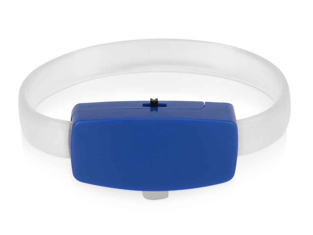 Многофункциональный браслет с белым светодиодом. Кнопка для мигающего света (левое положение) и непрерывного света (крайнее правое положение). Для выключения светодиода установите кнопку в среднее положение. Батарейки включены.