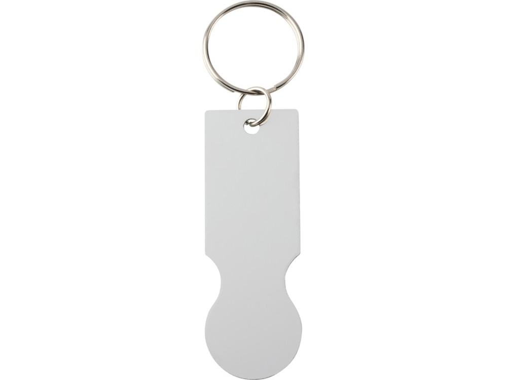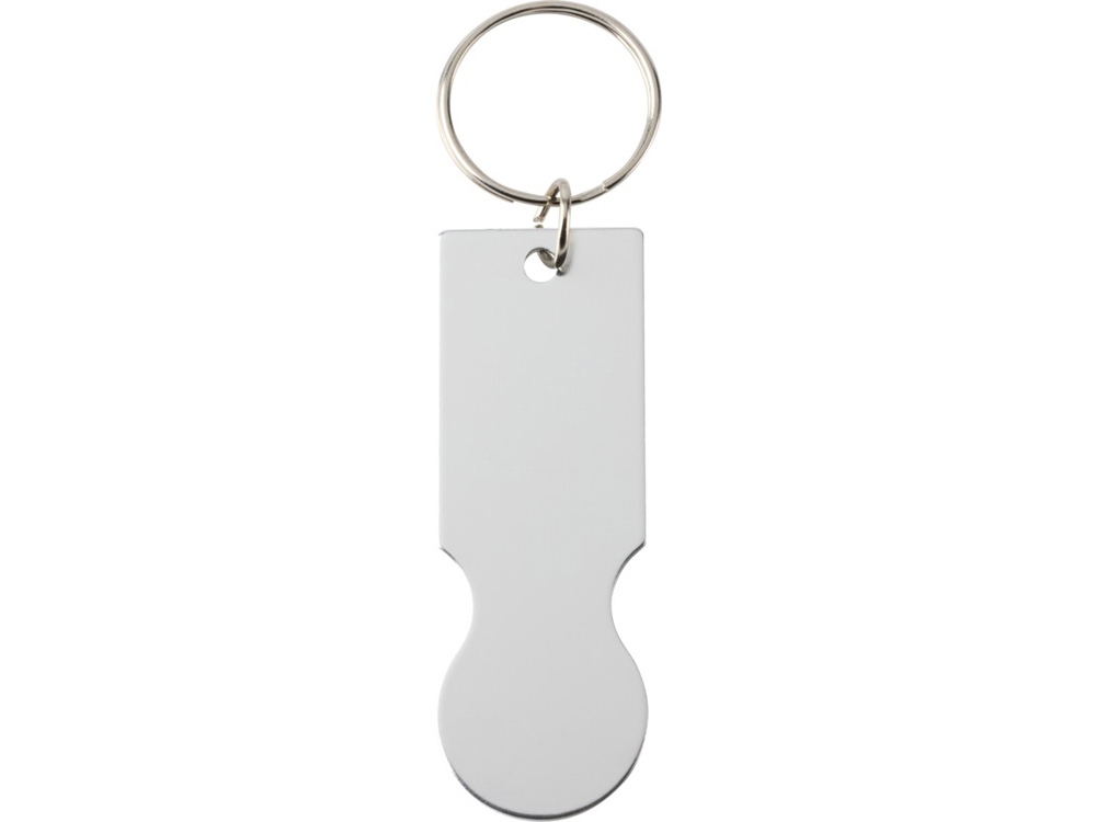 Металлический брелок для ключей Rhea с монетой для тележки предназначен для большинства тележек супермаркетов, позволяя открывать их без монет или жетонов. Сделан из переработанного алюминия.