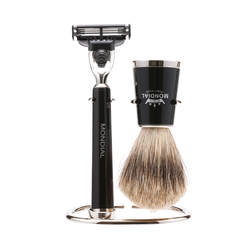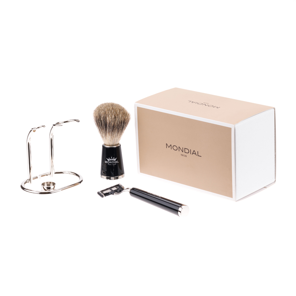 Бритвенный набор MONDIAL: станок MACH3, помазок, подставка, смола в черном цвете/никелированная латунь, в картонной коробке можно заказать в нашей компании по самой доступной цене от рублей.