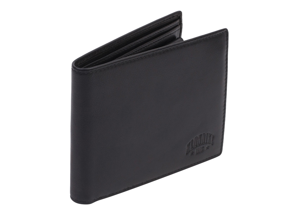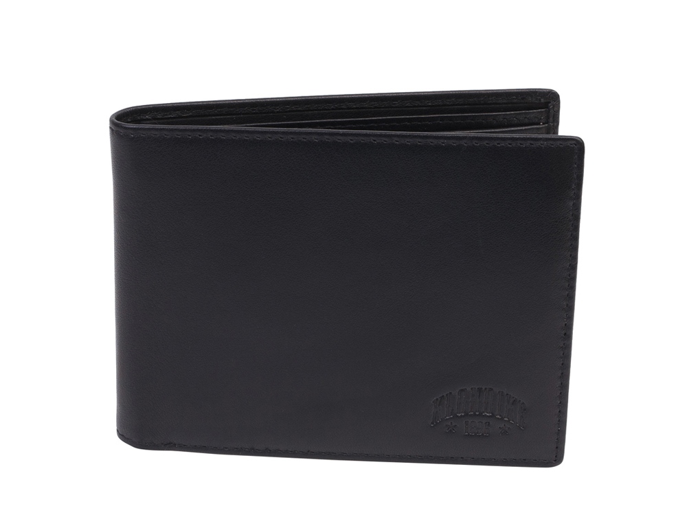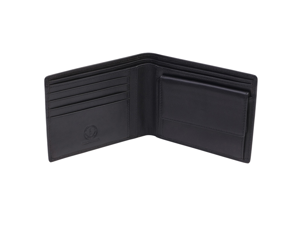 Бумажник мужской серии Claim, включает в себя четыре отделения для кредитных карт, три боковых скрытых отделения, одно отделение для монет, закрывается на кнопку, два отделения для купюр, позволяющие хранить купюры в развернутом виде.