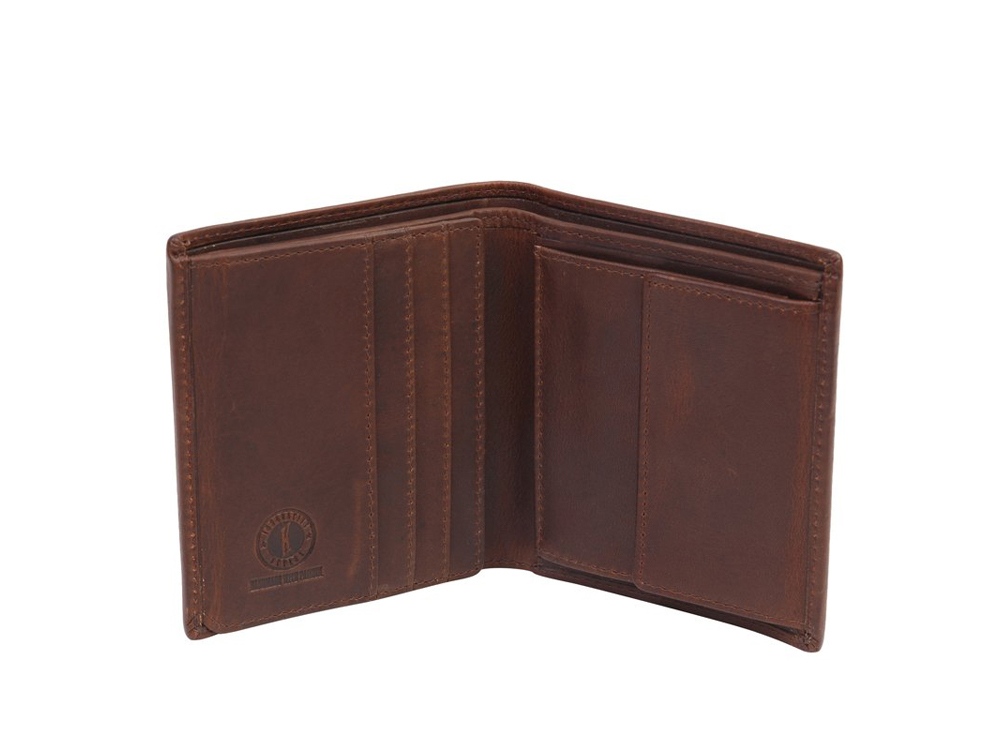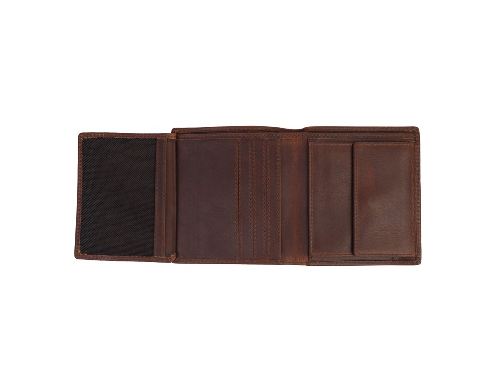 Бумажник мужской серии Dawson, включает в себя шесть отделений для кредитных карт, два боковых скрытых отделения, одно скрытое сетчатое отделение, одно отделение для монет, закрывается на кнопку, два отделения для купюр, позволяющие хранить купюры в развернутом виде.