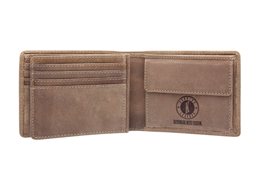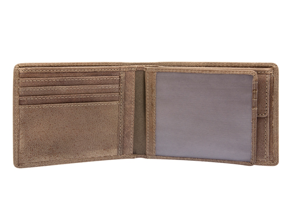 Бумажник мужской Tony, включает в себя восемь отделений для кредитных карт, одно отделение с прозрачным окошком, три скрытых отделения по бокам, два отделения для купюр, позволяющие хранить купюры в развернутом виде, одно отделение для монет, закрывается на кнопку.