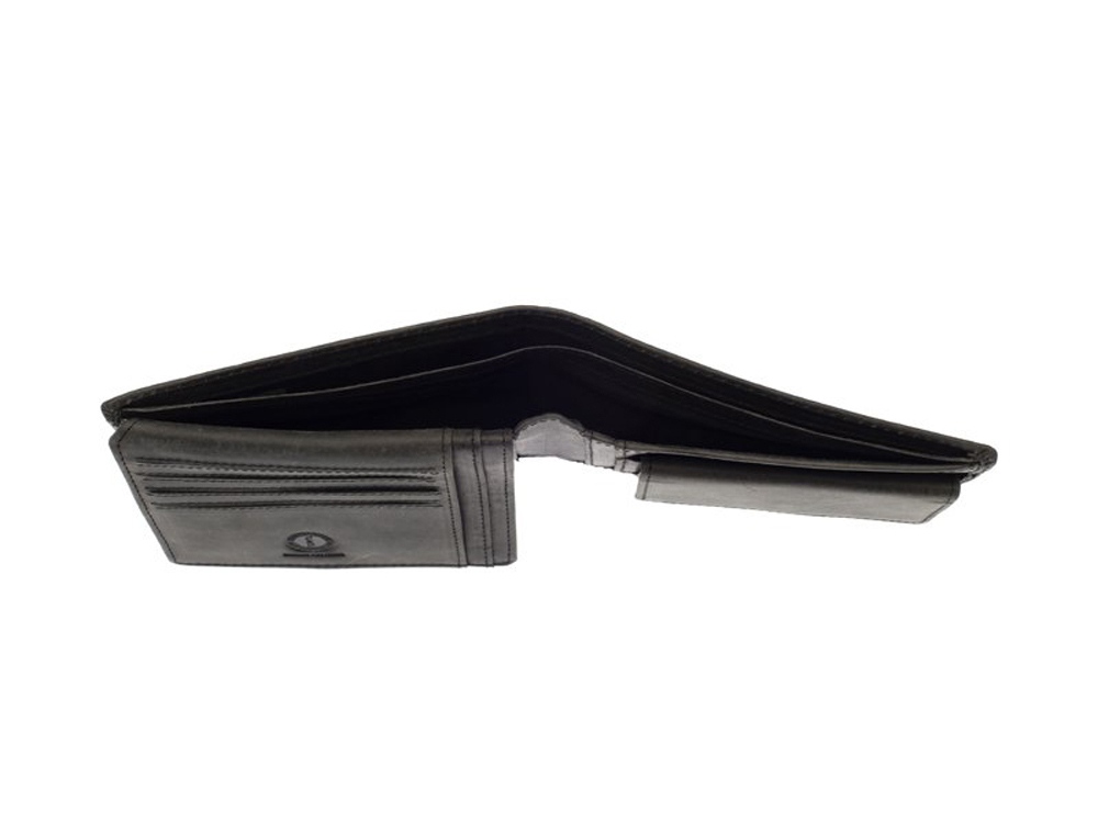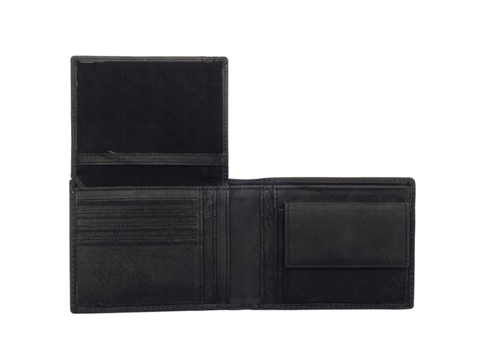Бумажник мужской серии Yukon, включает в себя восемь отделений для кредитных карт, и, семь боковых скрытых отделений, одно скрытое сетчатое отделение, одно отделение для монет, закрывается на кнопку, два отделения для купюр, позволяющие хранить купюры в развернутом виде.