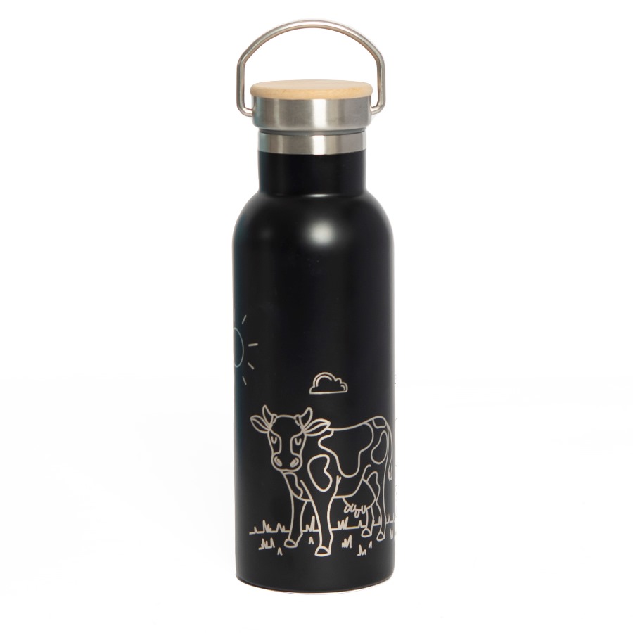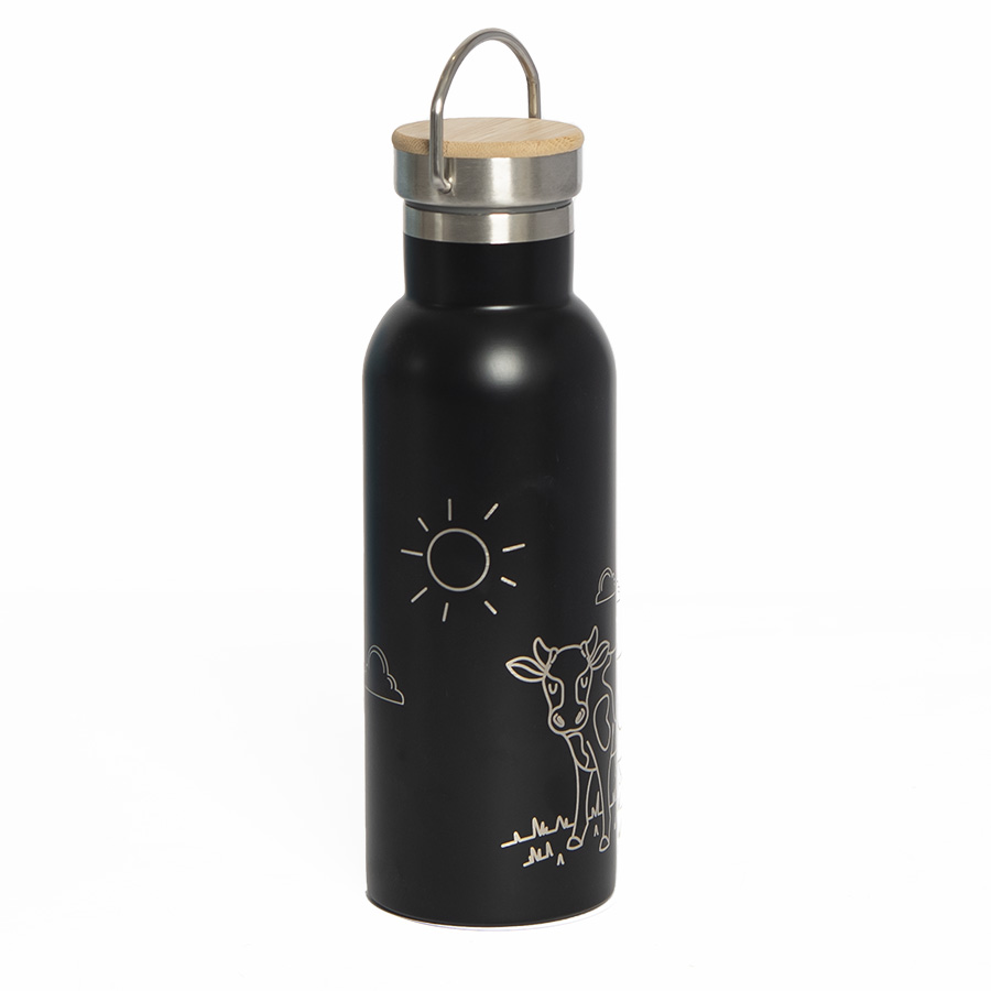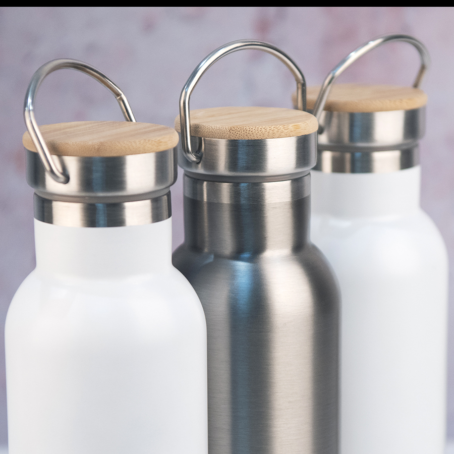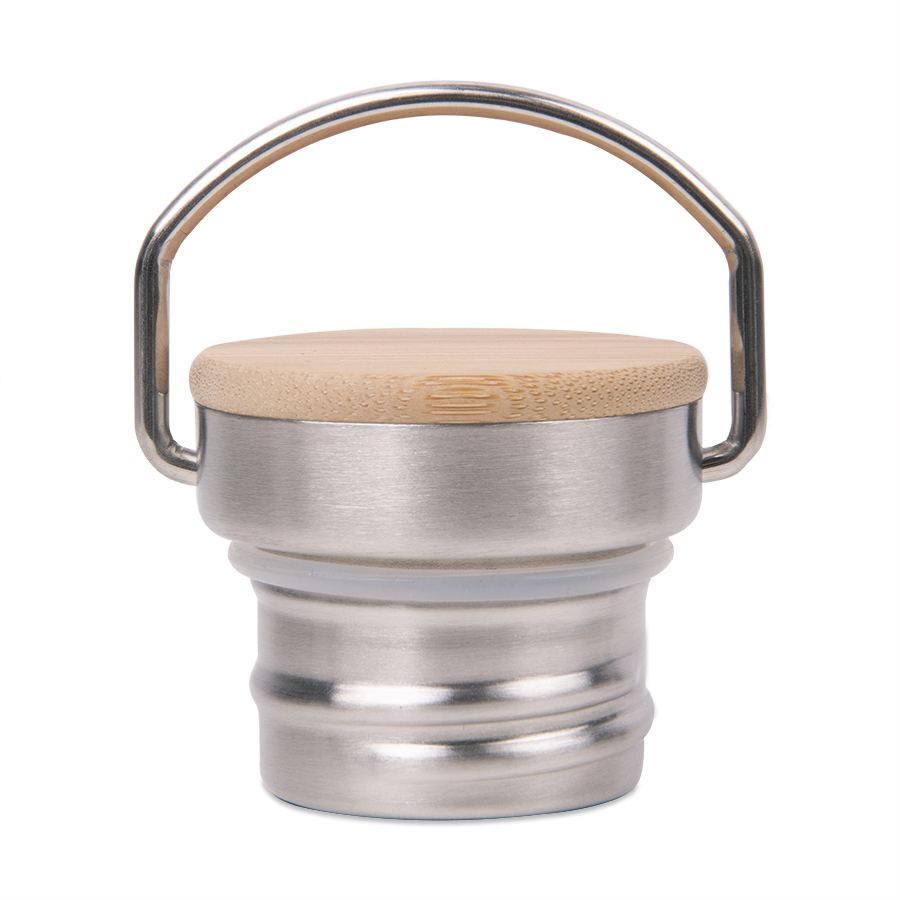 Бутылка для воды с двойными стенками из нержавеющей стали.Держатель на крышке для удобства переноски.Верхняя часть крышки из бамбука, отлично подходит для персонализации